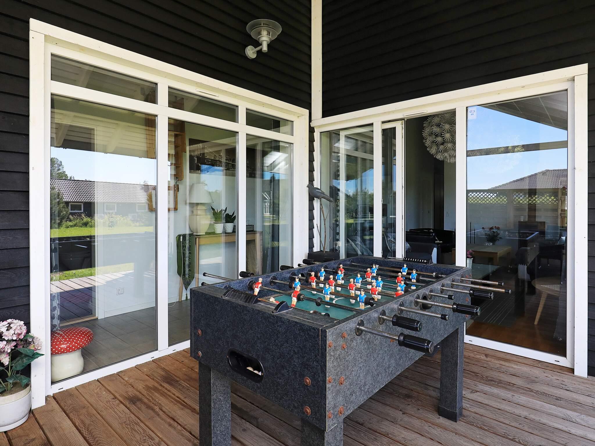 Das Ferienhaus ist modern eingerichtet und bietet viel Platz für die ganze Familie im offenen Küchen-/Wohnbereich. Die Küchenausstatung ist umfassend, vom Wohnbereich hat man Ausblick zur Holzterrasse und weiter zum großen Rasengrundstück. Zur technischen Ausstattung im Haus gehören auch deutsche TV-Sender zur Auswahl im TV sowie WLAN. Darüber hinaus gibt es eine energieeffiziente Luft-Luft-Wärmepumpe sowie einen Holzofen für kühlere Abende. Für den Freizeitspaß stehen Flippermaschine und Tischkicker bereit.
