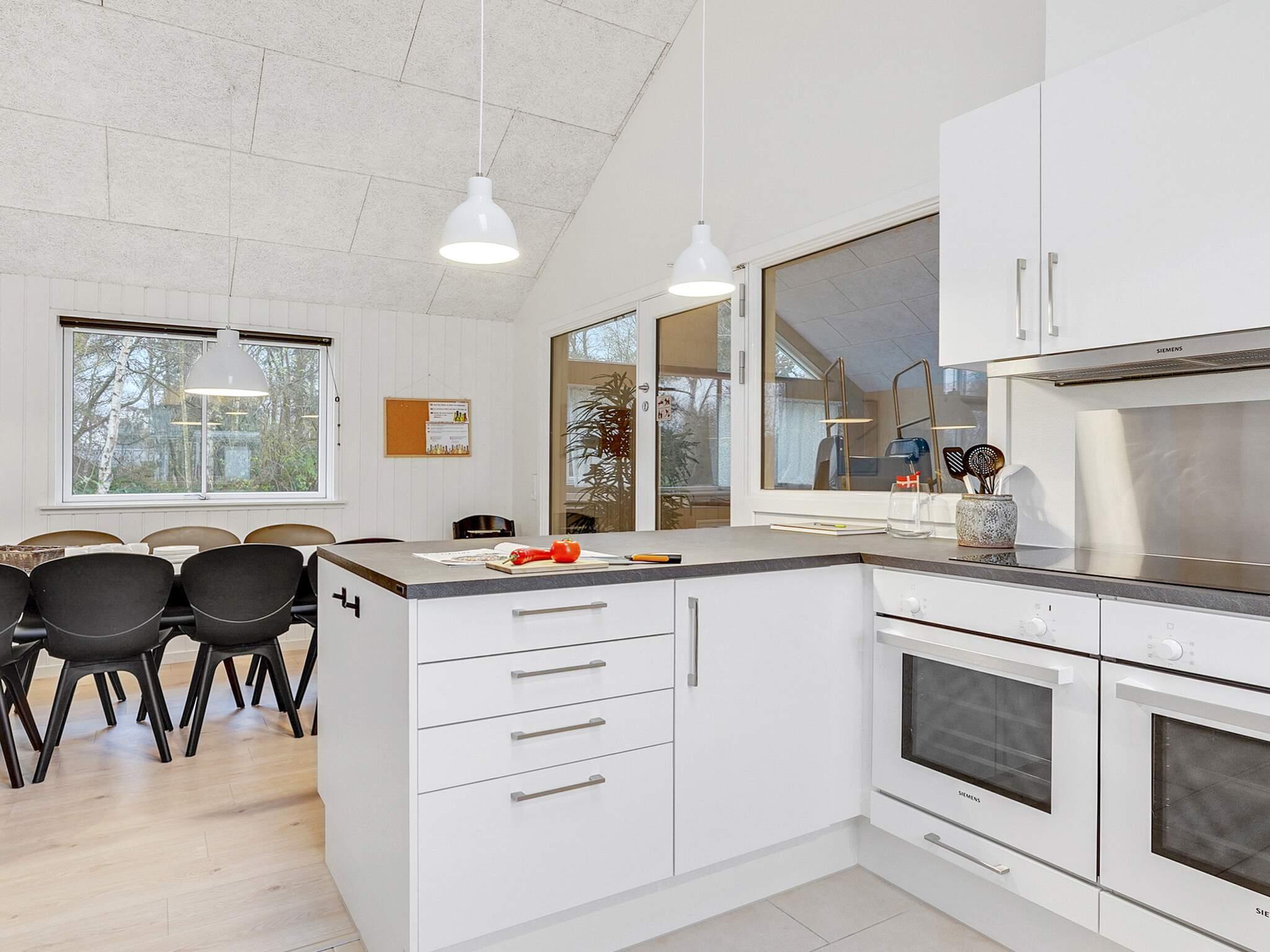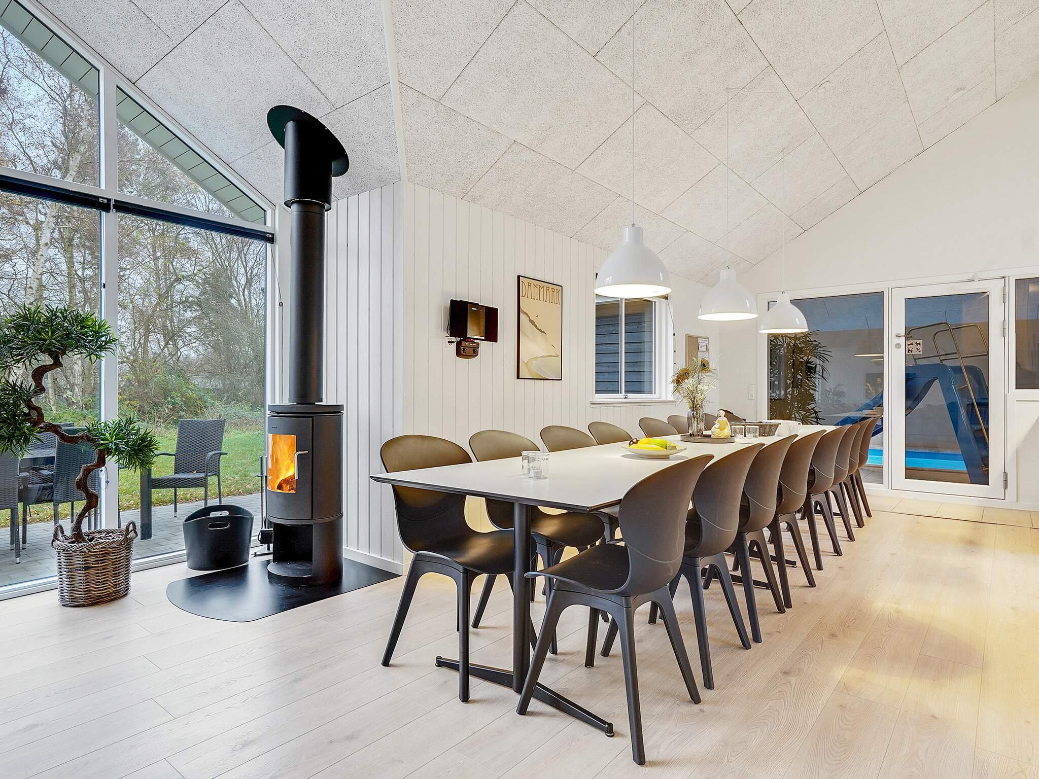 In der Mitte des Hauses befinden sich die Wohnküche und der Holzofen des Hauses, der an kalten Tagen für zusätzliche Wärme und Gemütlichkeit sorgt. Vom langen Esstisch aus können Sie die Schwimmer im Pool beobachten und in der Sofaecke ein gutes Buch oder einen Film genießen. Das gesamte Haus verfügt über Fußbodenheizung.