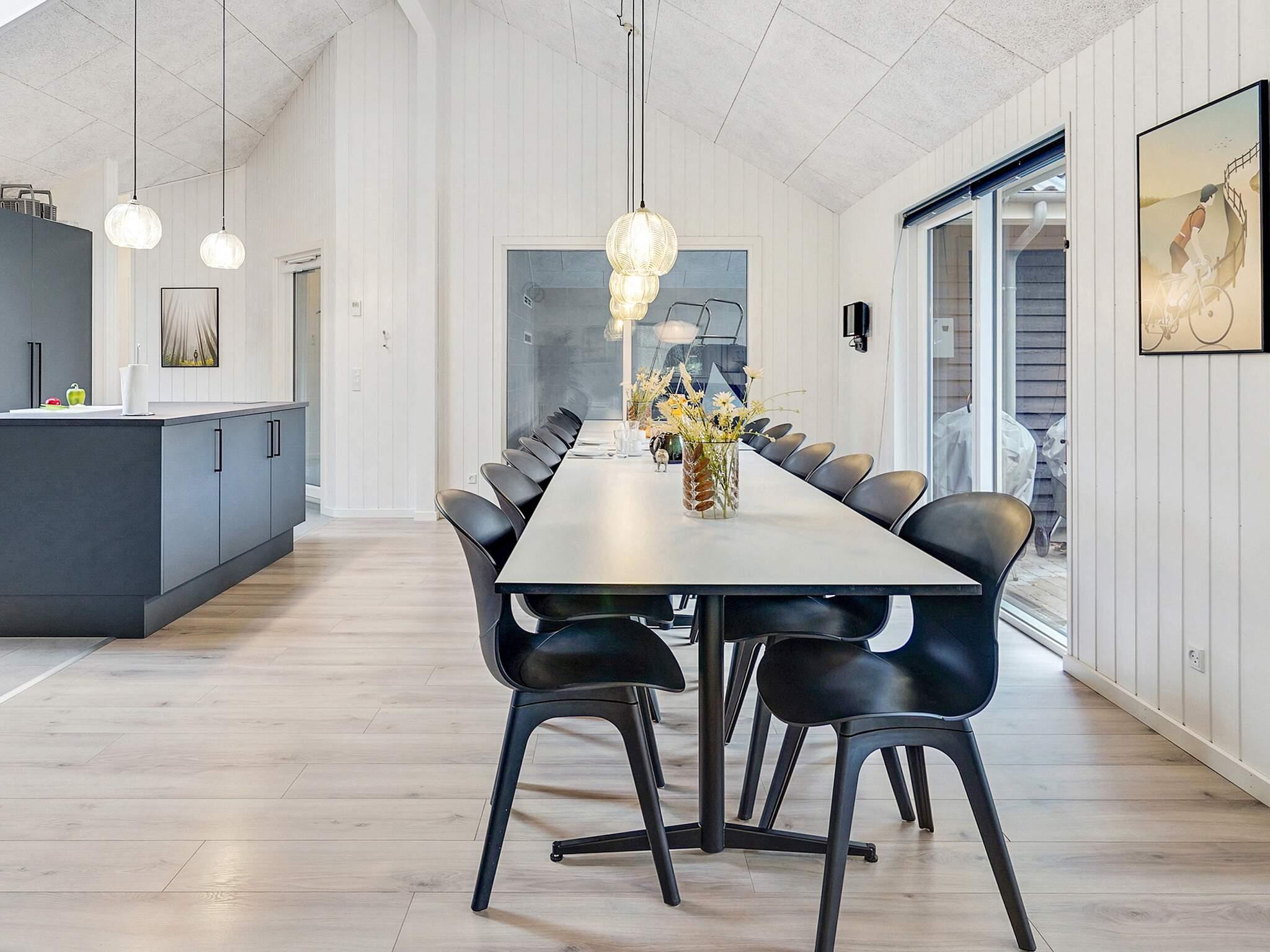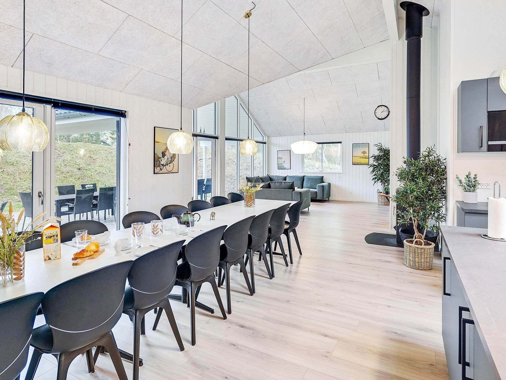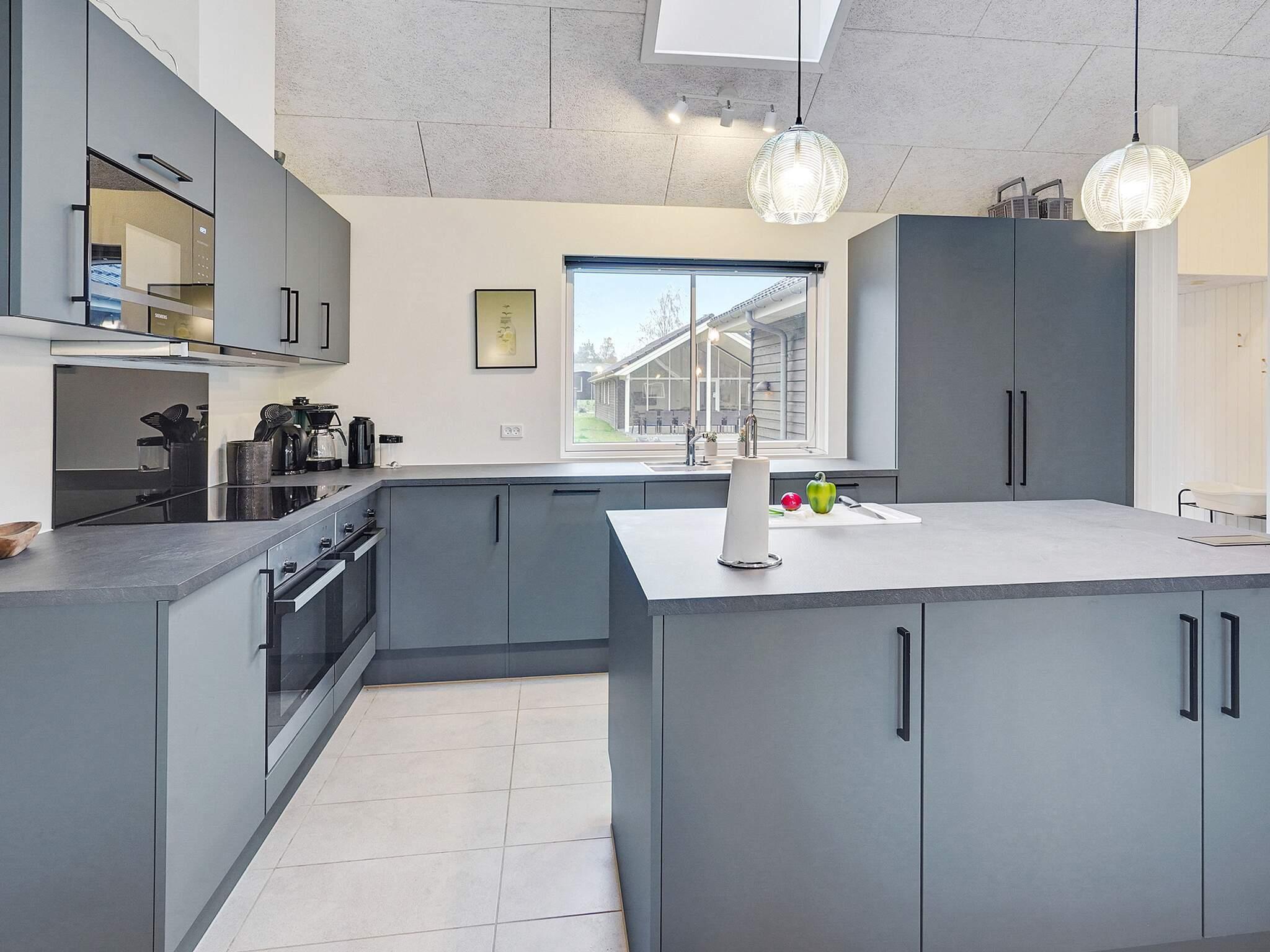 Vom Eingangsbereich aus betreten Sie die Wohnküche, das Herzstück des Ferienhauses. Hier gibt es hohe Decken und viel Platz rund um den Esstisch, sodass alle zusammenkommen können. Die Küche selbst ist ebenfalls gut ausgestattet mit einem Doppelbackofen, einem Kühlschrank, einem Geschirrspüler und zusätzlichen Kochplatten. Im Wohnzimmer befindet sich außerdem eine Sofagruppe in der Nähe des Holzofens, der an kühlen Tagen für wohlige Wärme sorgt.