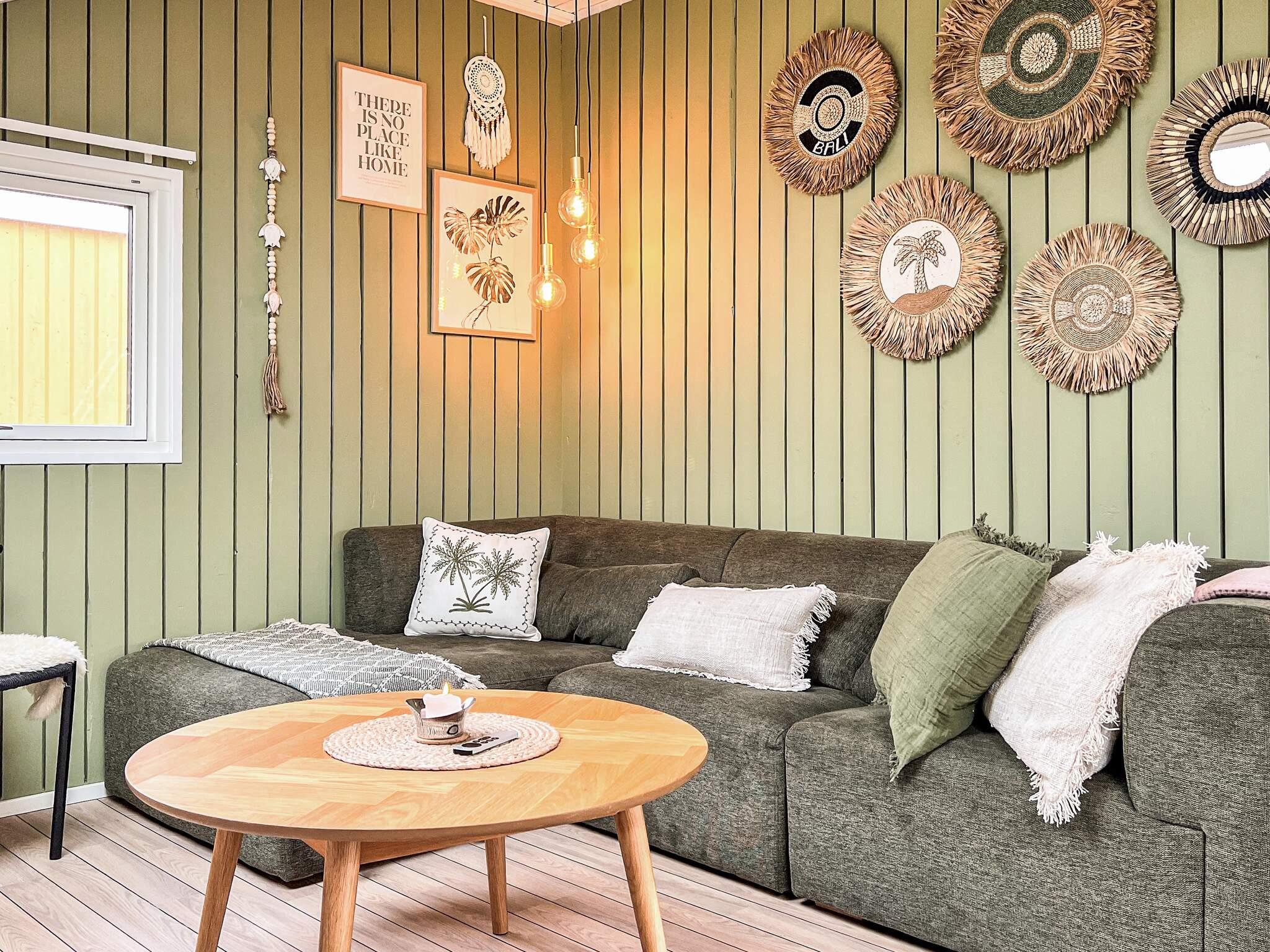 Im Inneren erwartet Sie eine entspannte Bohème-Atmosphäre mit hellen Farben und natürlichen Materialien. Zwei große Oberlichter sorgen für viel Tagesglicht im Haus, ein schönes Gefühl von Ruhe und Urlaubsstimmung wird so erzeugt. Die offene Wohnküche vereint Küche, Essbereich und Wohnzimmer in einem – ideal für gesellige Stunden und ruhige Abende vor dem Holzofen.