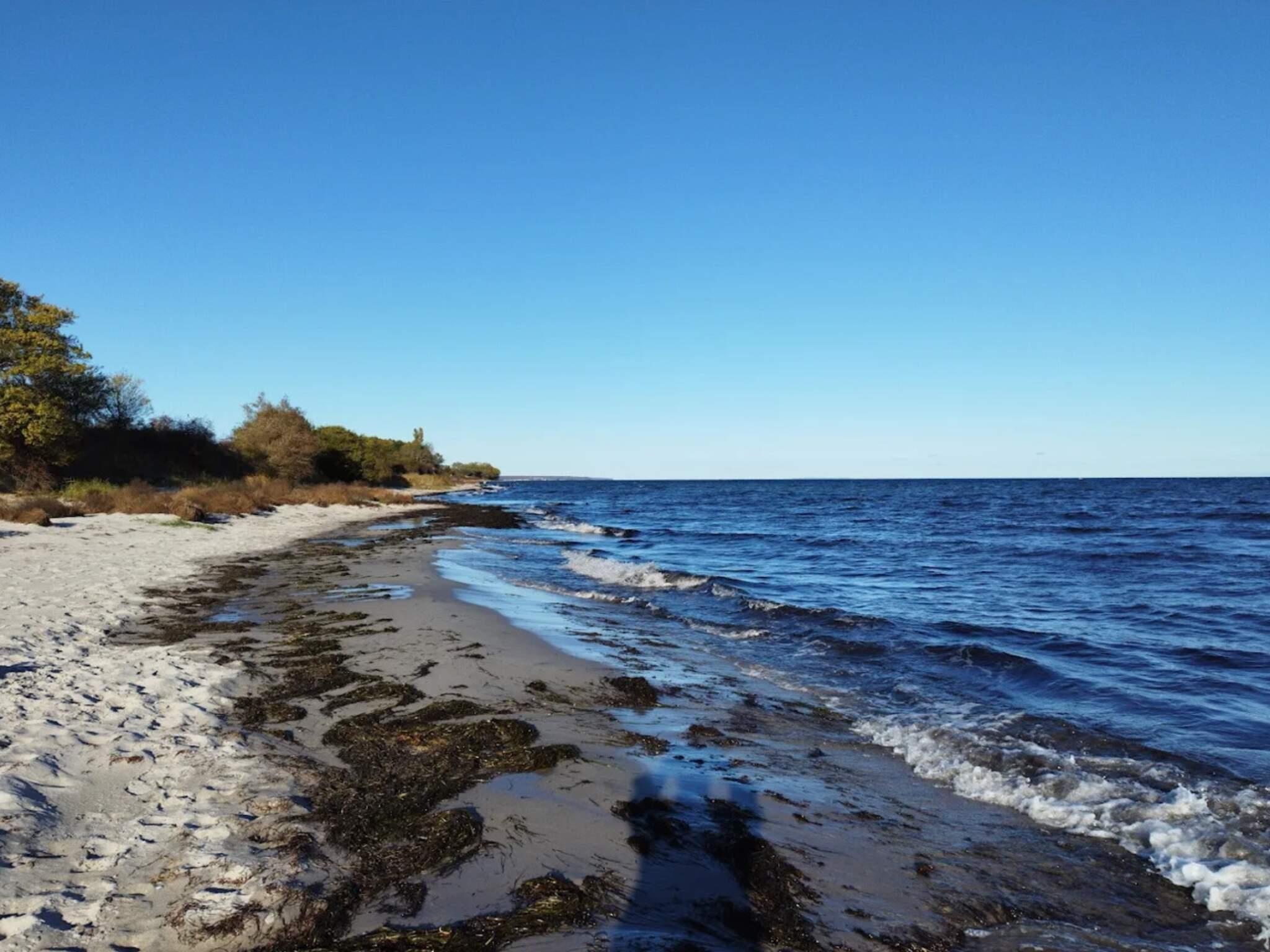 Im Außenbereich findet man die teilweise überdachte Terrassenfläche mit Ausblick auf die große Rasenfläche für Spiel und Spaß, die von schützenden Bäumen umgeben ist und so guten Schutz vor Sonne und Wind bietet. Für Sommertage steht ein Gartengrill bereit. Ein kleiner Pfad führt hinunter ans nahe Strandufer.