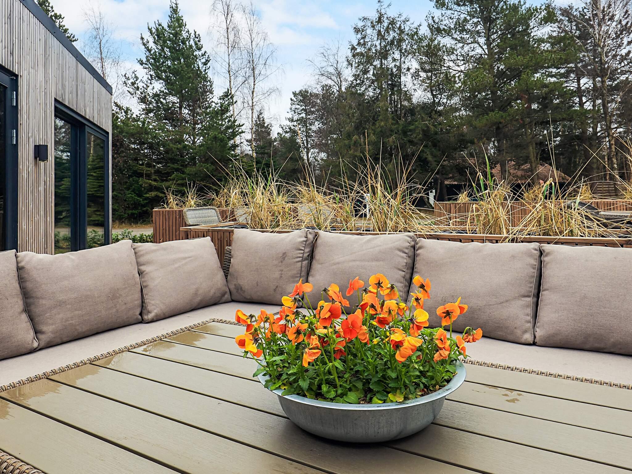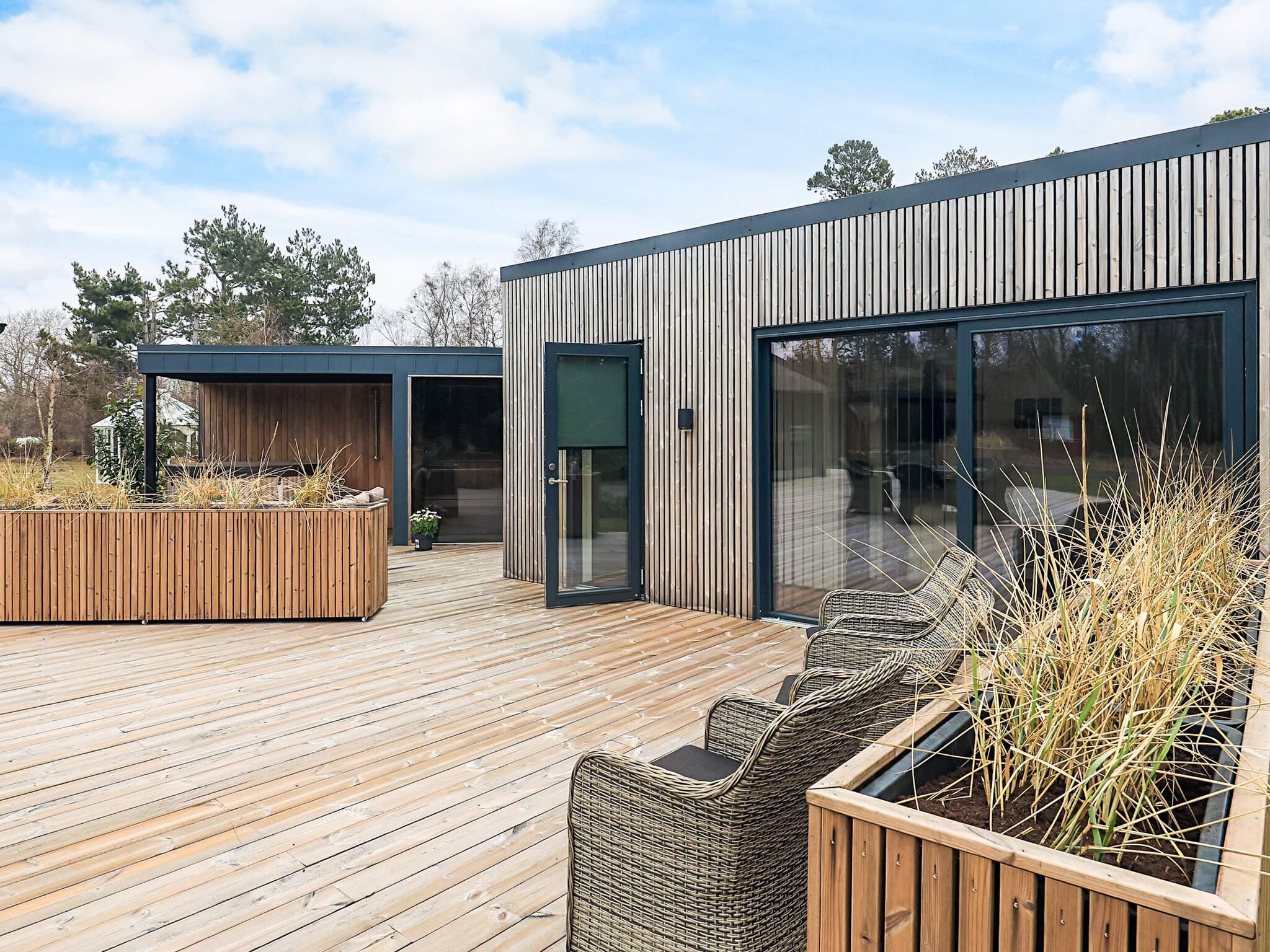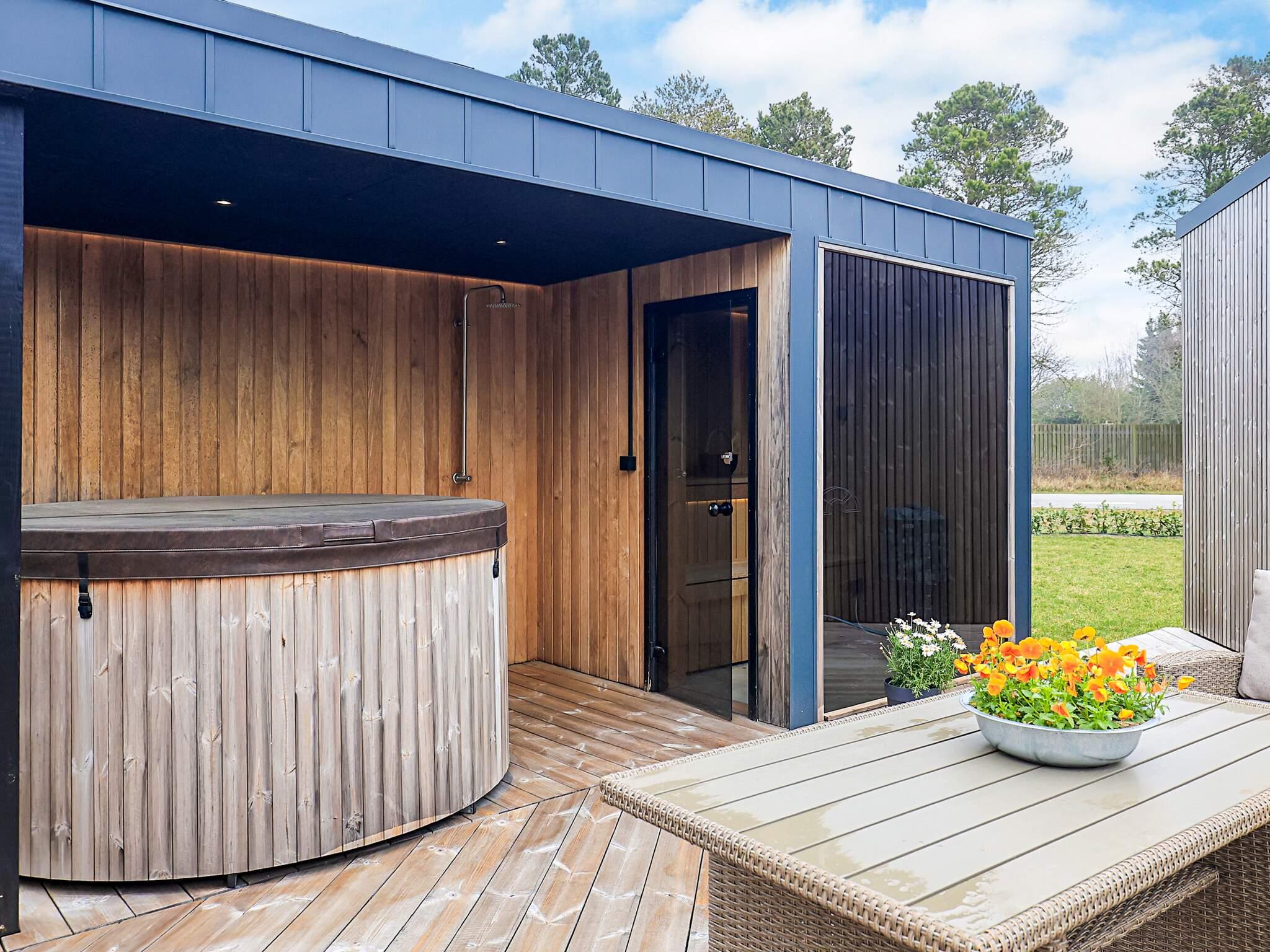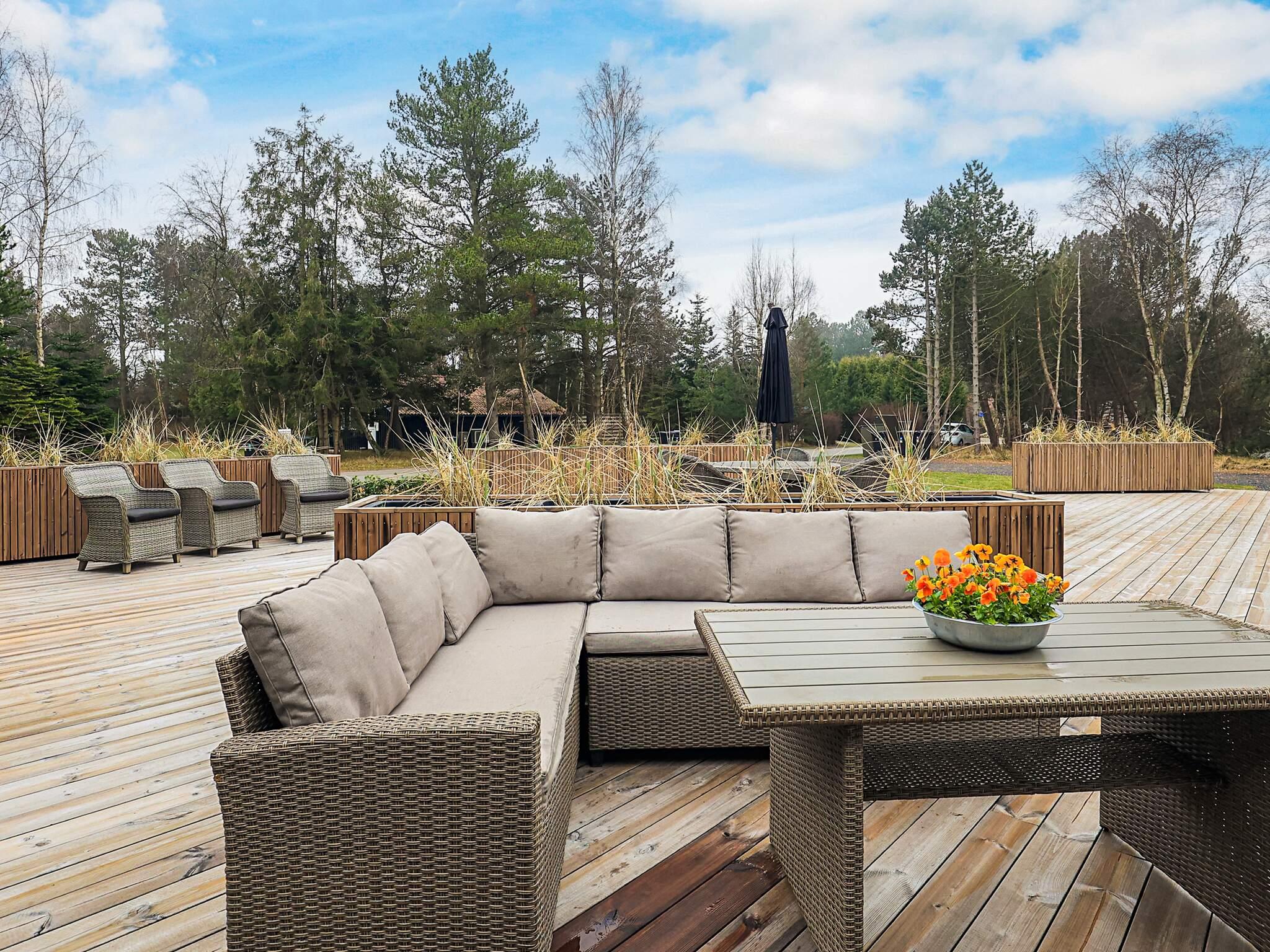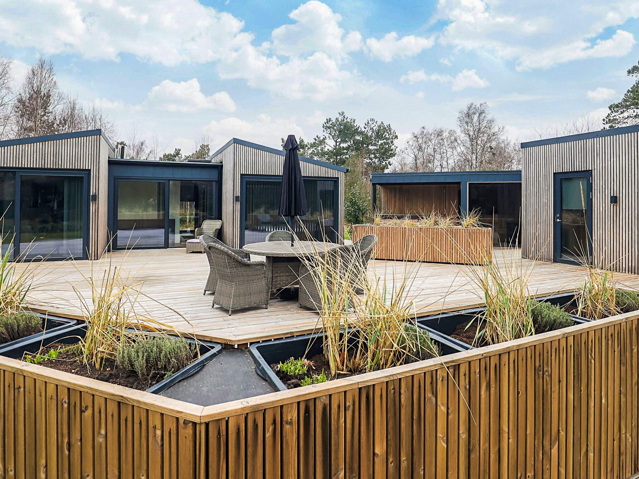 Das Ferienhaus liegt auf einem großzügigen 1.200 m² großen Grundstück mit viel Platz zum Spielen und Entspannen. Die große Holzterrasse erstreckt sich rund um das Haus und ist von mehreren Räumen aus zugänglich. Hier stehen Gartenmöbel, Sonnenliegen und ein Gasgrill für gemütliche Abende im Freien bereit. Zusätzlich lädt der Wellnessbereich auf der Terrasse mit Wildnisbad, Sauna und Außendusche zum Entspannen ein.