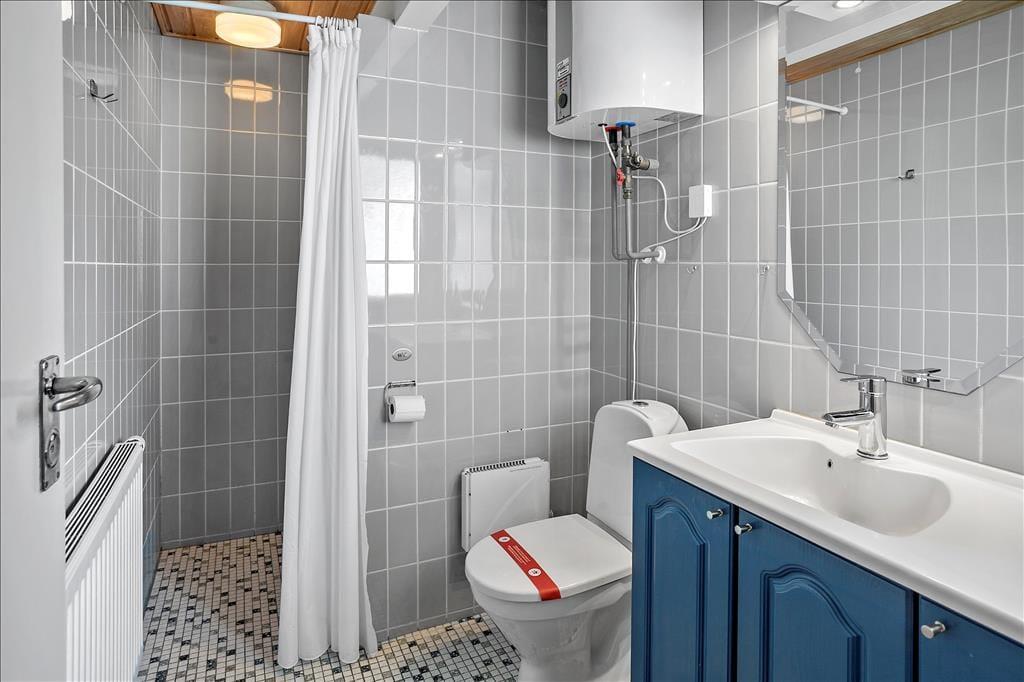 Bad mit WC, Dusche und Waschbecken.
