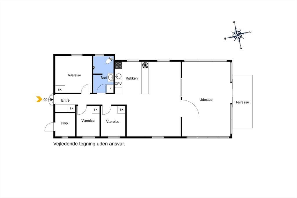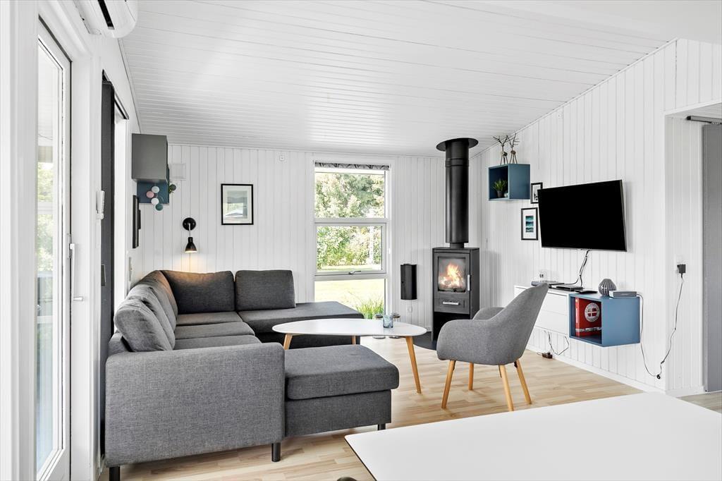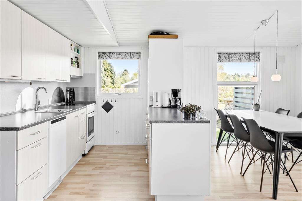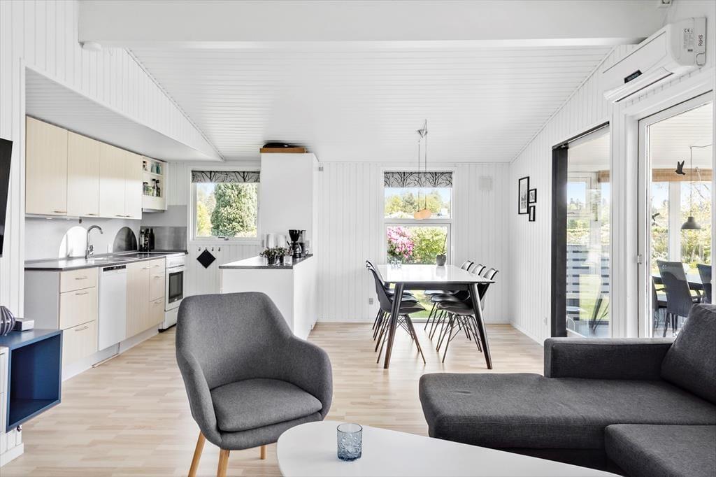 Schönes Ferienhaus mit einem Eingang/Flur, von dem aus man Zugang zum neu renovierten Badezimmer des Hauses und zu den 3 Schlafzimmern des Hauses hat, alle mit einem Doppelbett. Vom Verteilerflur aus gelangt man weiter in die Küche, die in gepflegten weißen Elementen erscheint und in der es an nichts fehlt. In offener Verbindung mit der Küche befindet sich das Wohnzimmer, das durch einen Esstischbereich direkt neben der Küche unterteilt ist, während sich auf der anderen Seite ein Sofa- und Fernsehbereich befindet.