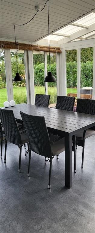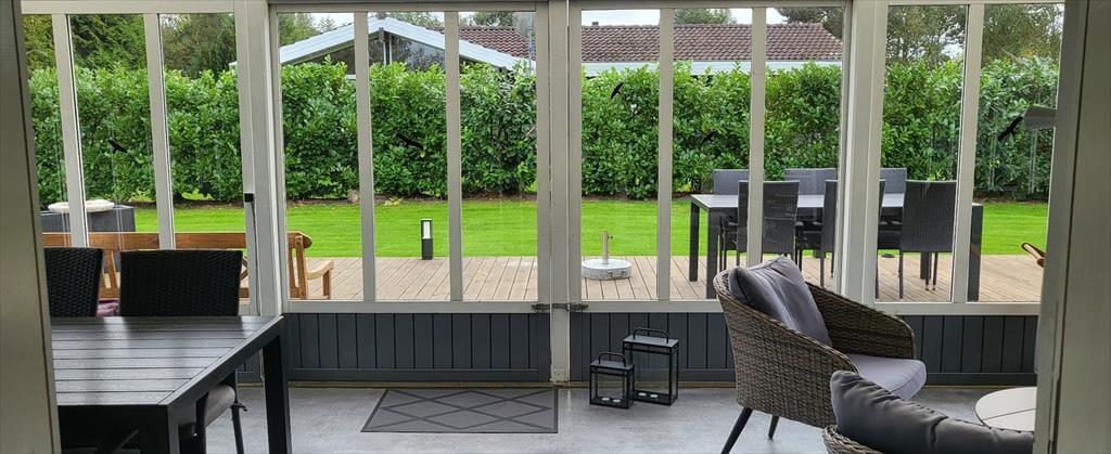 Vom Wohnzimmer aus hat man Zugang zu einem schönen Wintergarten und von dort aus weiteren Zugang zur Terrasse und zum Garten.