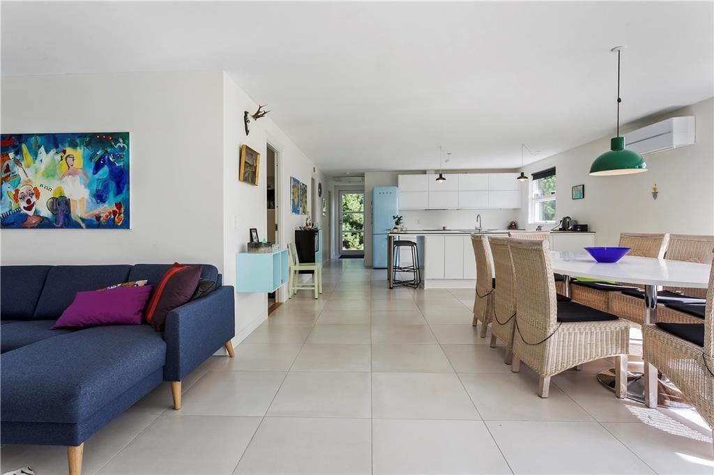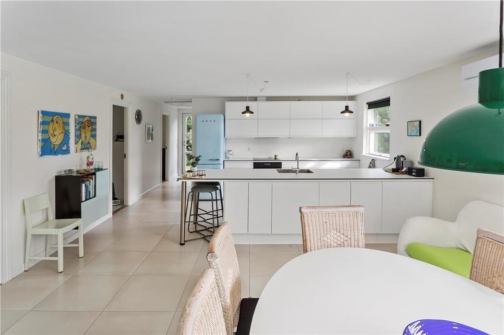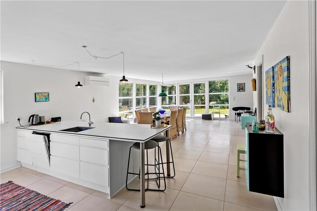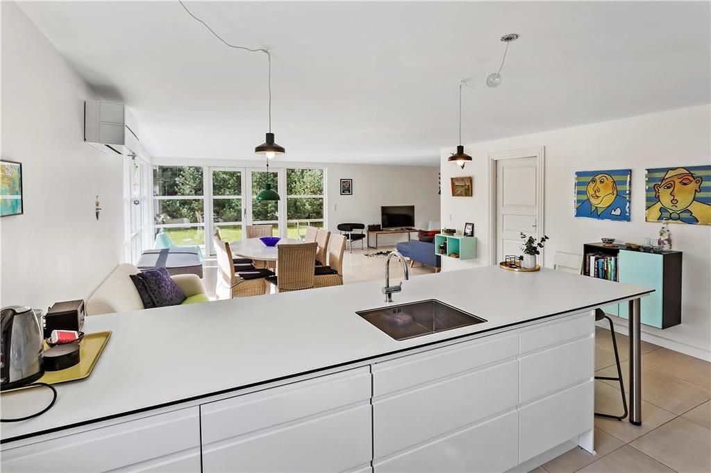 Darüber hinaus bietet das Haus eine große und leckere offene Küche, die sowohl mit dem Essbereich als auch dem Wohnzimmer verbunden ist. Alles in einem guten hellen Stil und mit einem großen Fenster zum Garten.