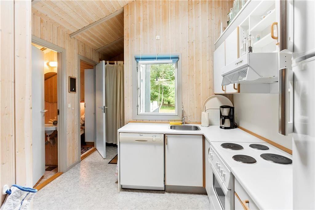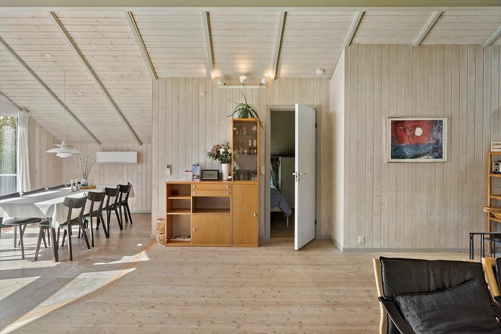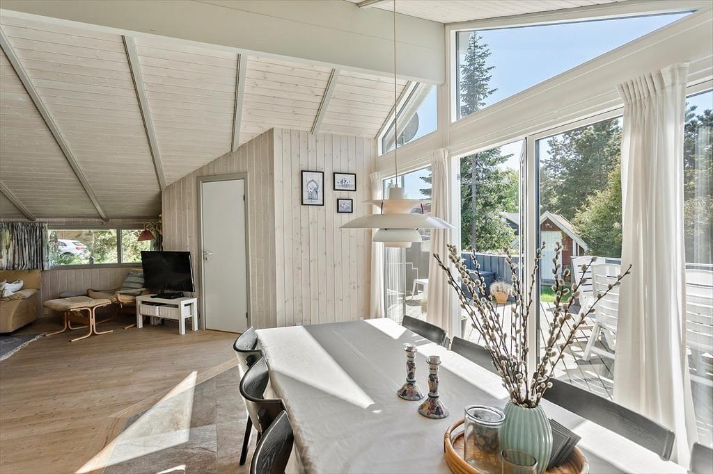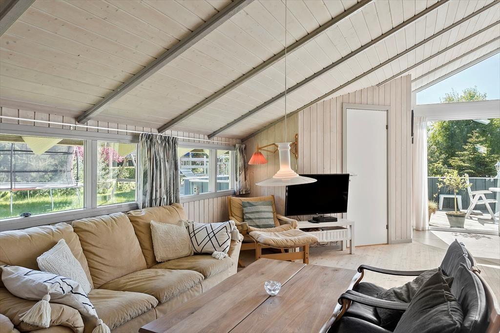 Schön und helle Einrichtung im ganzen Haus. Sie kommen im Haus rein zur einer kleinen Eingangshalle, mit Zugang zu einem Schlafzimmer und das Badezimmer und Gästetoilette. Weiter geht es zur Küche, in der sich alles befindet, was für den Urlaub benötigt wird, und dann weiter in das große und gut eingerichtetes Wohnzimmer das in hellem und einladendem Zustand erscheint. Vom Wohnzimmer aus haben Sie Zugang zu den letzten drei Schlafzimmern des Hauses sowie zur schönen Holzterrasse mit Gartenmöbeln und einer kleinen überdeckte Terrasse.