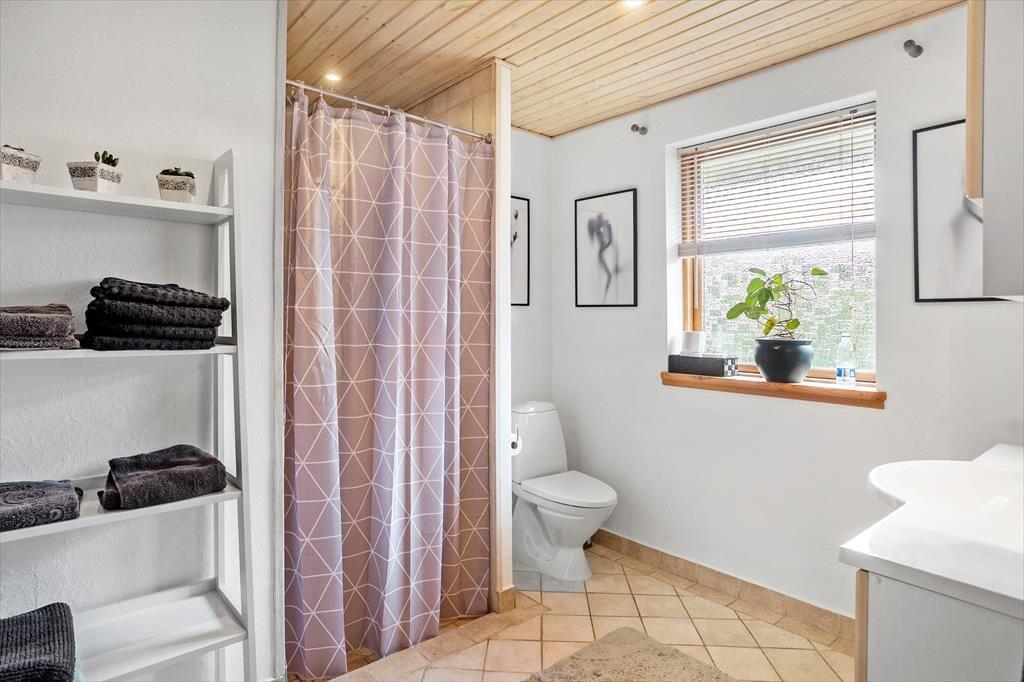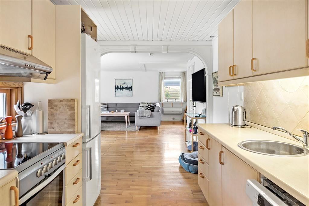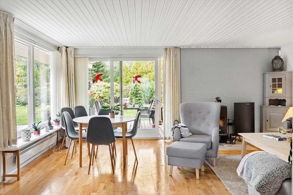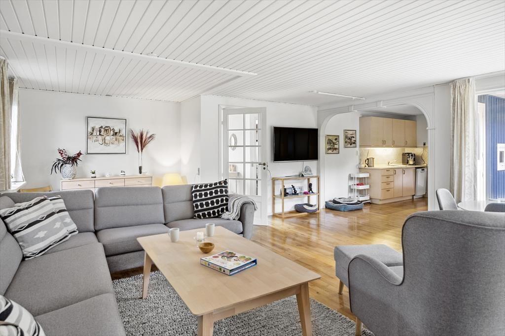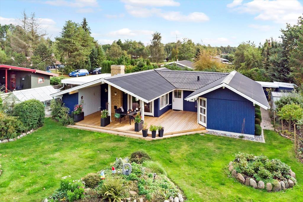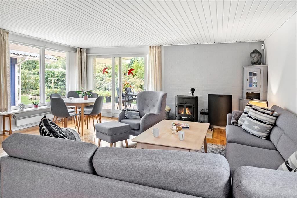 Das Ferienhaus verfügt über: Eingangshalle, 1 großes Badezimmer, und 1 Gäste-WC mit WC, Waschmaschine und Trockner, 3 gute Schlafzimmer, schöne Küche in offener Verbindung zum großen Wohnzimmer mit Holzofen, Wärmepumpe, Essecke, Sofaecke und Ausgang zur schönen Terrasse, die teilweise überdacht ist.