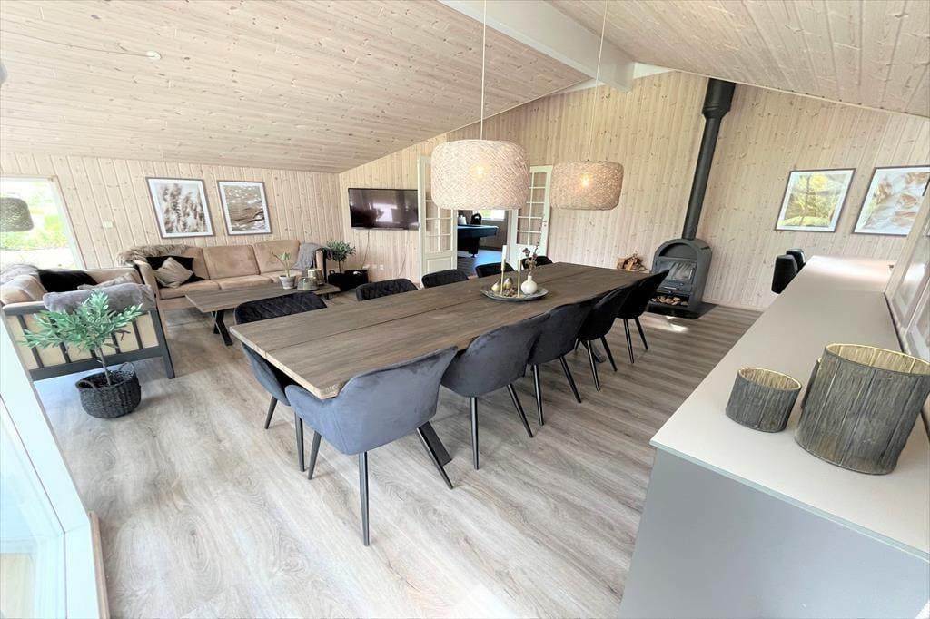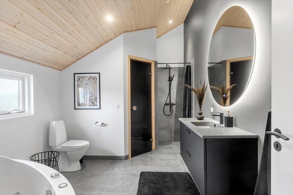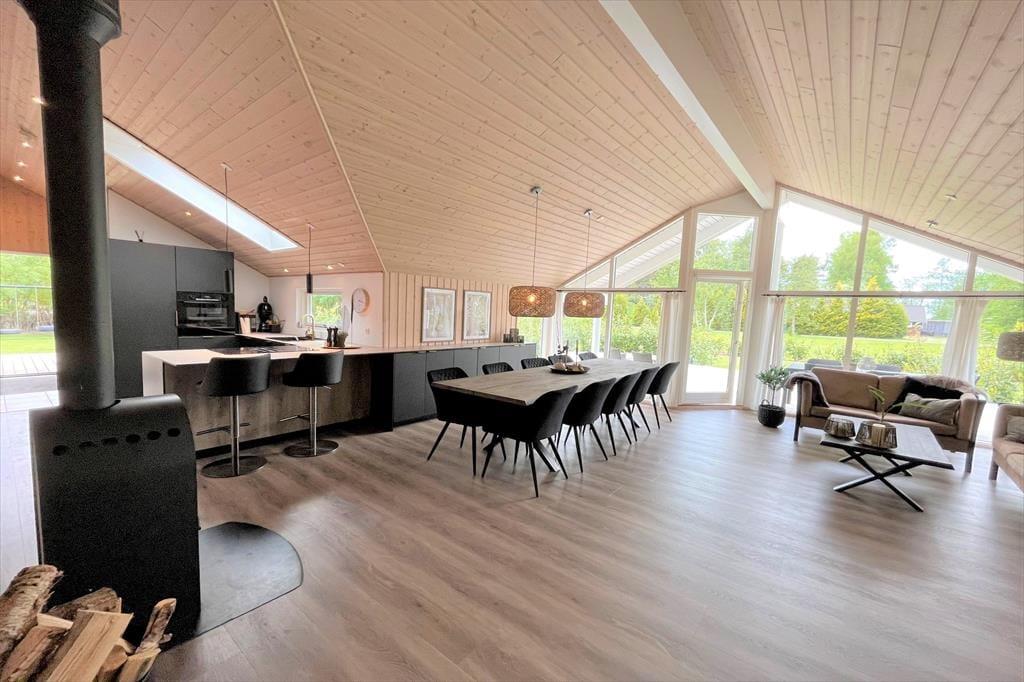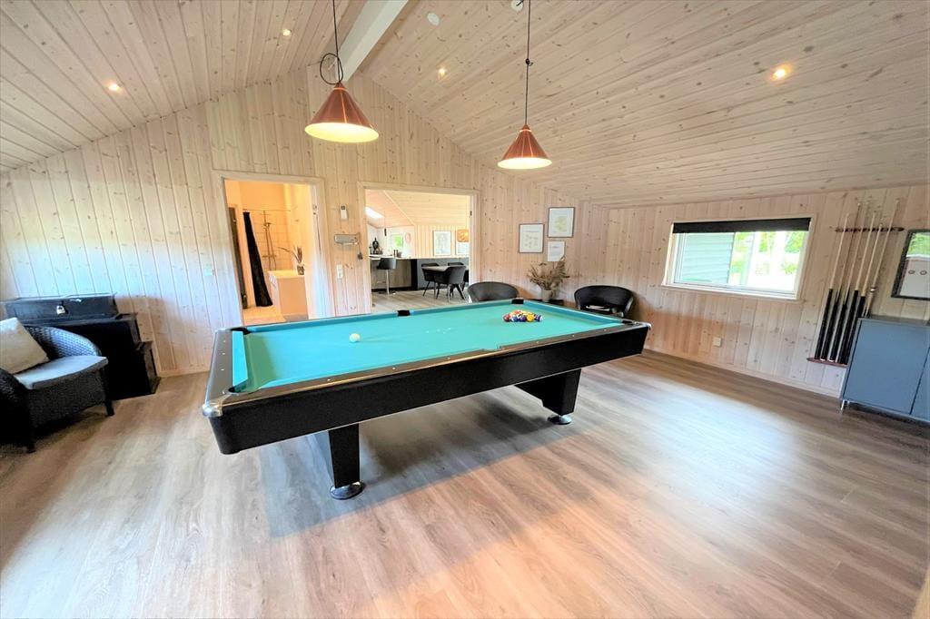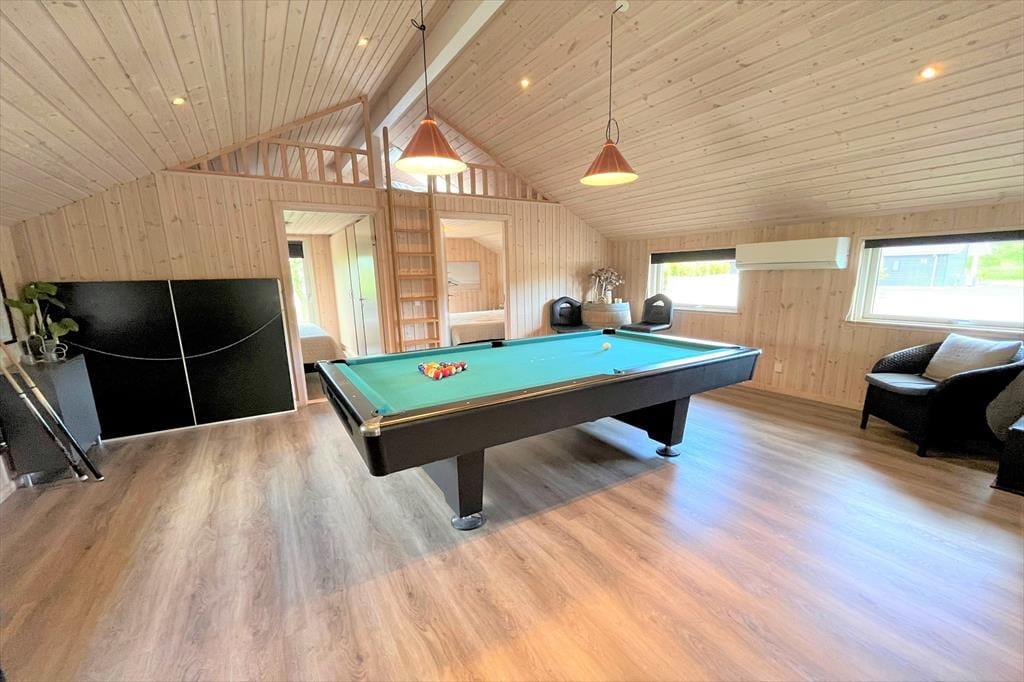 Das Ferienhaus ist mit 4 guten und schönen Schlafzimmern ausgestattet, alle Schlafzimmer sind alle Doppelzimmer mit Doppelbetten, sowie einem großen Dachboden, auf dem 2 Personen schlafen können. Darüber hinaus ist das Haus mit Zugang zu einem kleinen guten Eingang ausgestattet, in dem sich auch das einzige Badezimmer des Hauses befindet, das WC, Dusche, Waschmaschine und Trockner enthält. Darüber hinaus bietet das Ferienhaus die große offene Wohnküche, wo Sie an einem Ende die schöne und moderne Küche haben, in offener Verbindung mit dem Wohnzimmer, das einen Sofabereich und einen Essbereich hat. Auch vom Wohnzimmer aus gelangt man auf die große und schöne Terrasse sowie in den Garten. Vom Wohnzimmer gibt es auch einen Eingang zum Aktivitätsraum des Hauses, der sowohl einen Billardtisch als auch eine Tischtennisplatte enthält, beim Aktivitätsraum finden wir Badezimmer Nummer 2 mit WC, Dusche, Whirlpool und einer köstlichen Sauna.