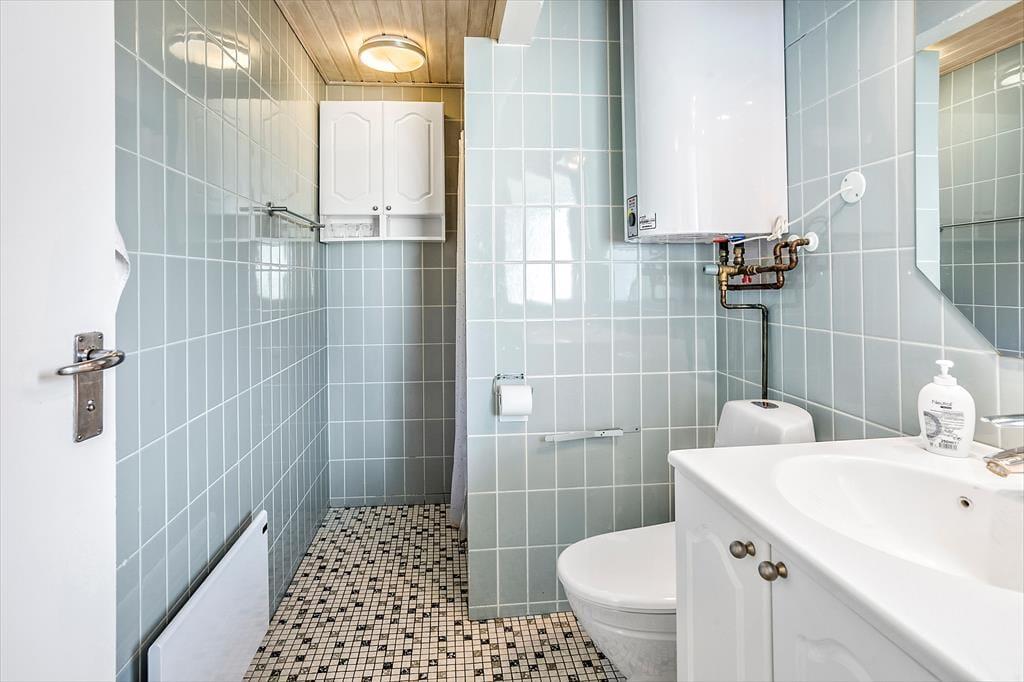Badezimmer mit Toilette, Dusche und Waschbecken.