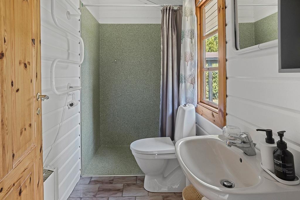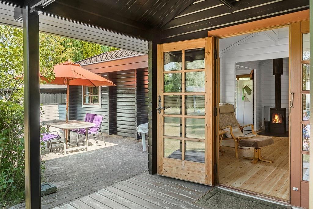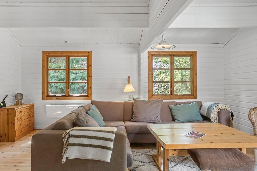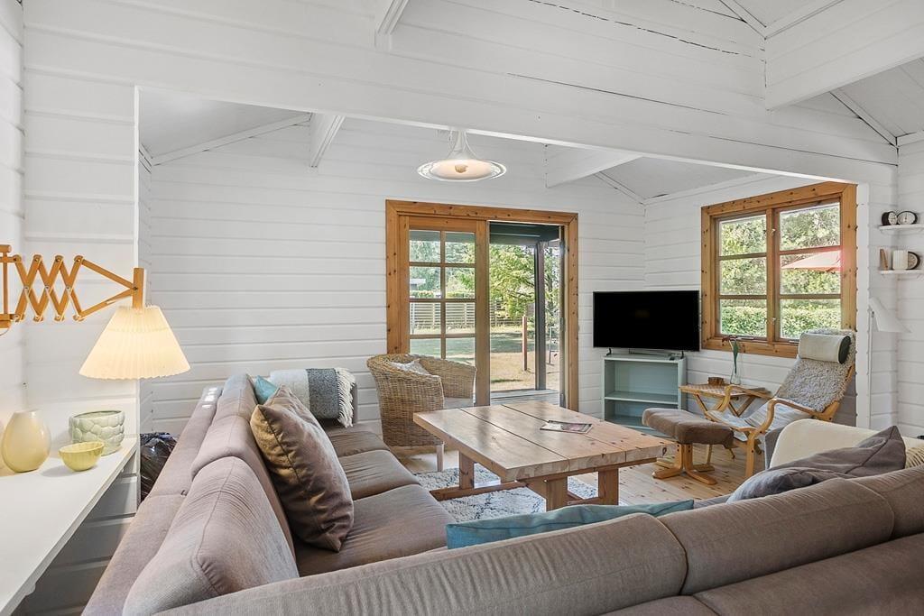 Helles und charmantes Sommerhaus mit 3 Schlafzimmern, 2 davon mit Doppelbett und 1 Zimmer mit Etagenbett. Darüber hinaus gibt es eine schöne offene Küche mit Essbereich, ein Wohnzimmer mit Sofaecke, TV und Holzofen. mit Zugang zur Terrasse, schließlich ein Badezimmer mit WC und Dusche.