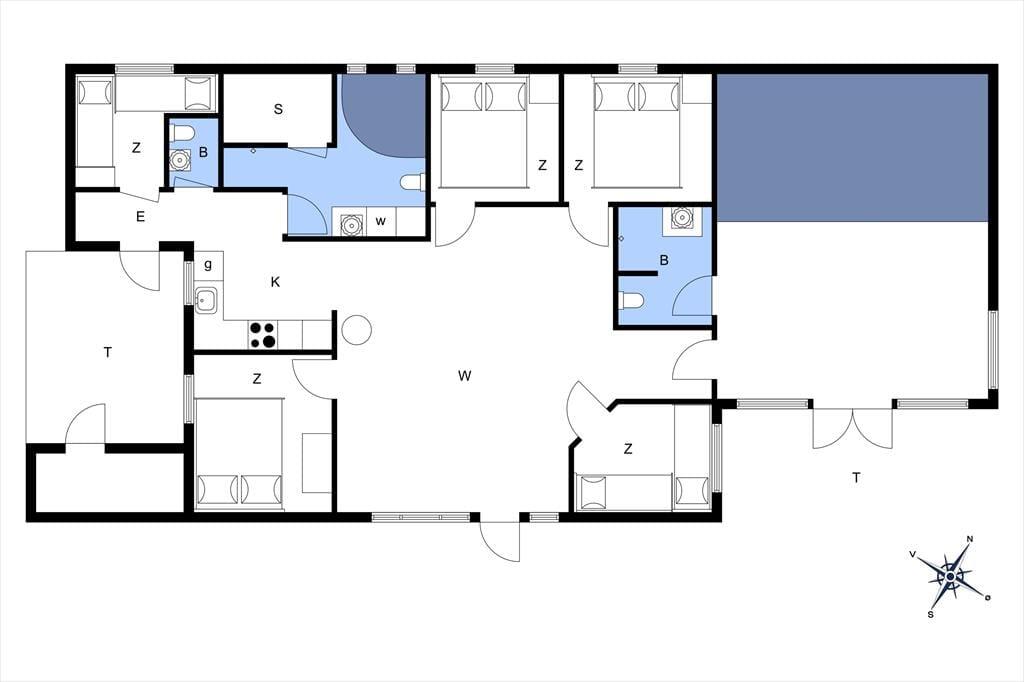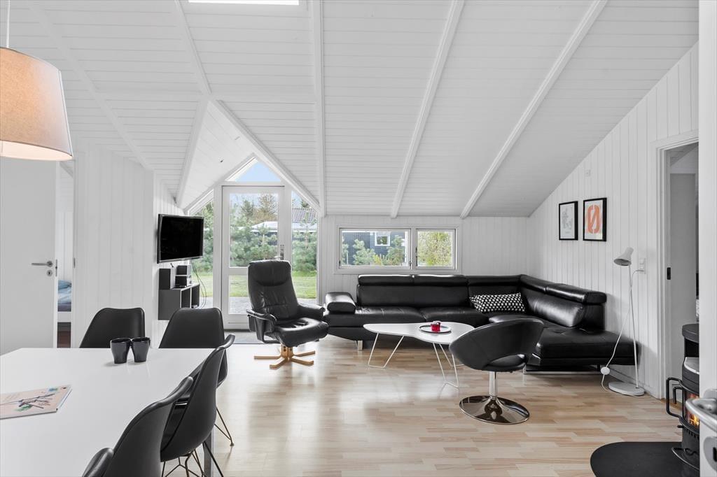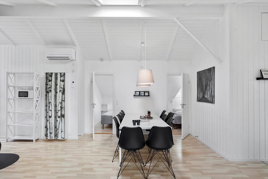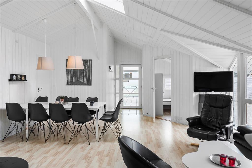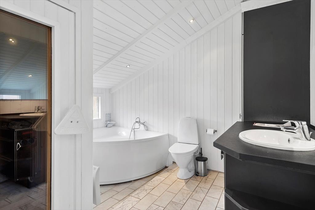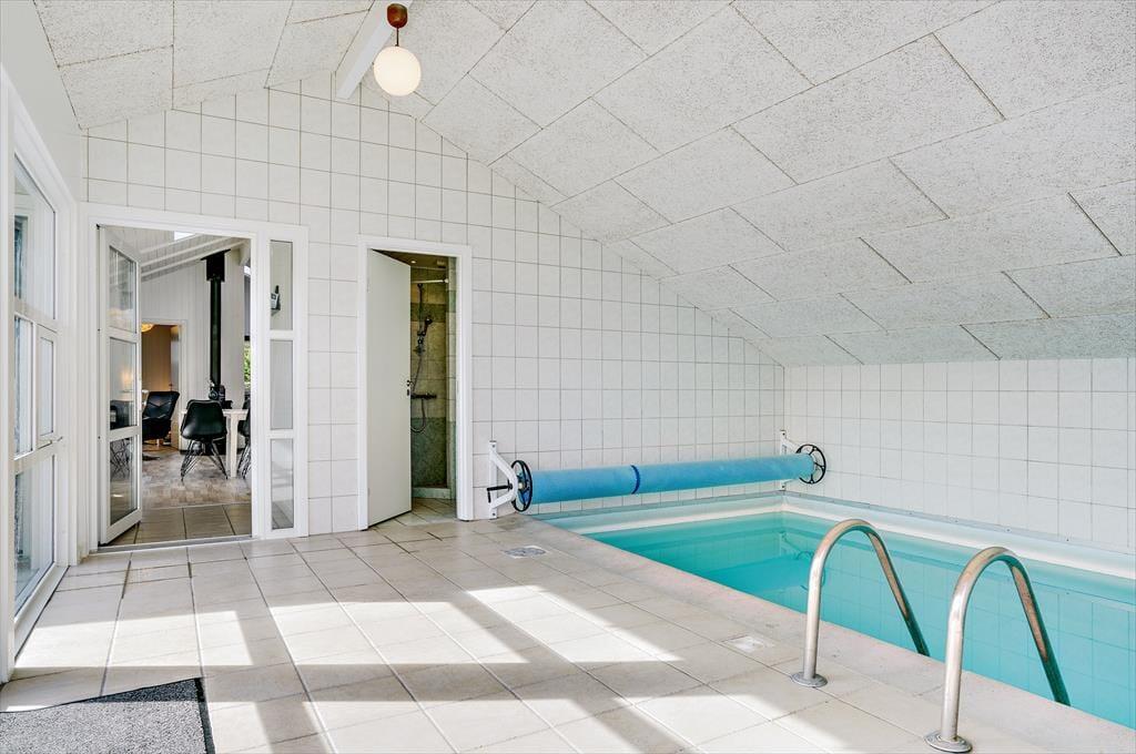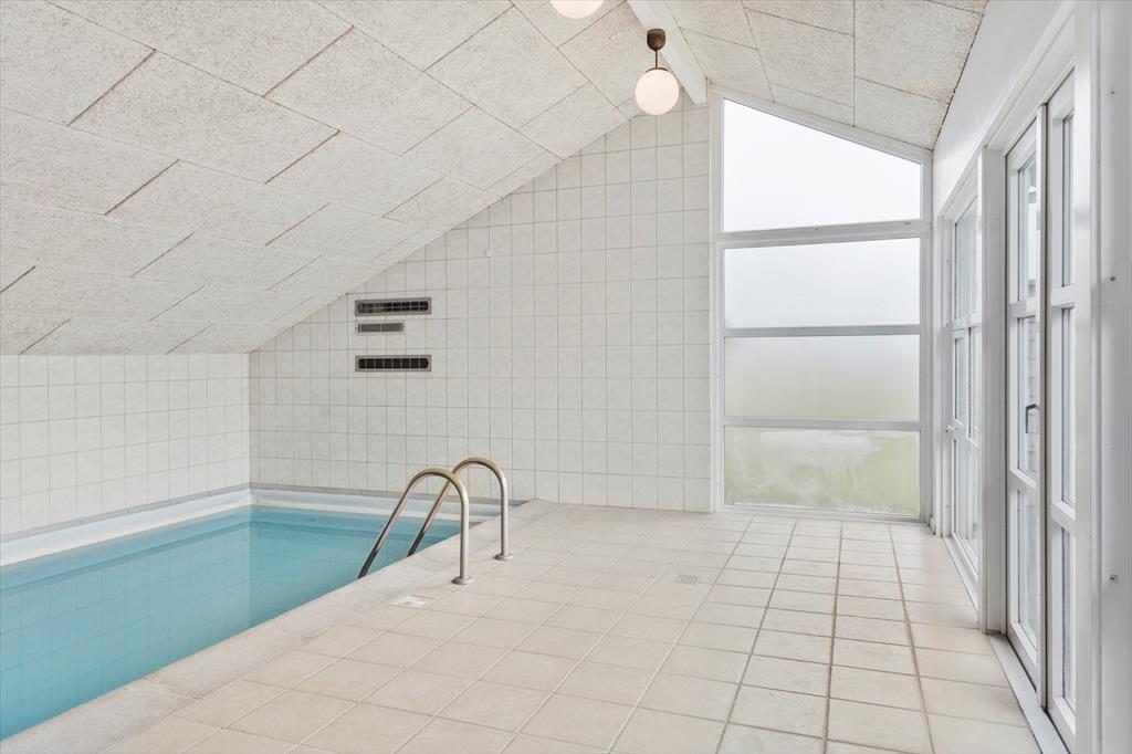 Schönes, hell eingerichtetes Ferienhaus mit 5 guten Schlafzimmern mit insgesamt 10 Betten, 2 Badezimmern und 1 WC, einer Küche in offener Verbindung zum Wohnzimmer, das auf einer Seite in einen Essbereich unterteilt ist eine Sofa- und TV-Ecke auf der anderen Seite, die auch Zugang zur Terrasse bietet. Darüber hinaus verfügt das Ferienhaus über eine Sauna und einen Whirlpool im Innenbereich. Last but not least befindet sich der Swimmingpool am Ende des Wohnzimmers, wo sich auch das eine Badezimmer befindet.