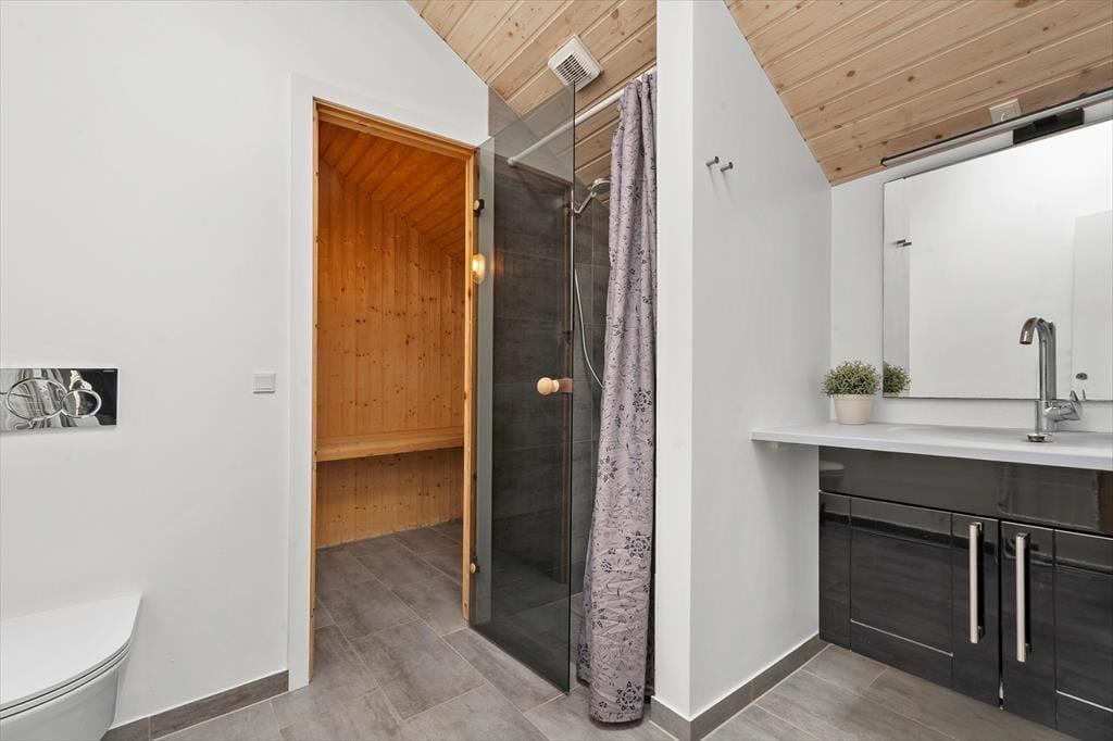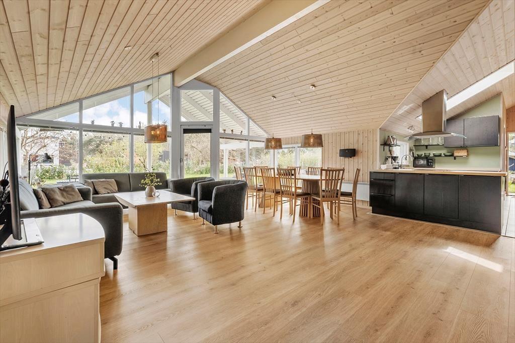 Das Ferienhaus ist für 10 Personen geeignet. Das Ferienhaus ist 141 m² groß und wurde 2005 gebaut. Das Ferienhaus bietet eine Eingangshalle, 4 gute Schlafzimmer, mit einem Doppelbett in 2 der Schlafzimmer und 2 Einzelbetten in den letzten 2 Schlafzimmern. Zusätzlich gibt es einen Dachboden mit 2 Schlafplätzen. Weiter gibt es 2 Badezimmer, mit Toilette, Dusche, Waschmaschine und Trockner in einem und Toilette, Dusche und Sauna im anderen. Weiter verfügt das Sommerhaus über eine schöne Wohnküche mit Essbereich und Sofaecke. Vom Wohnzimmer aus hat man Zugang zur schönen Terrasse des Hauses.