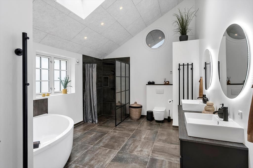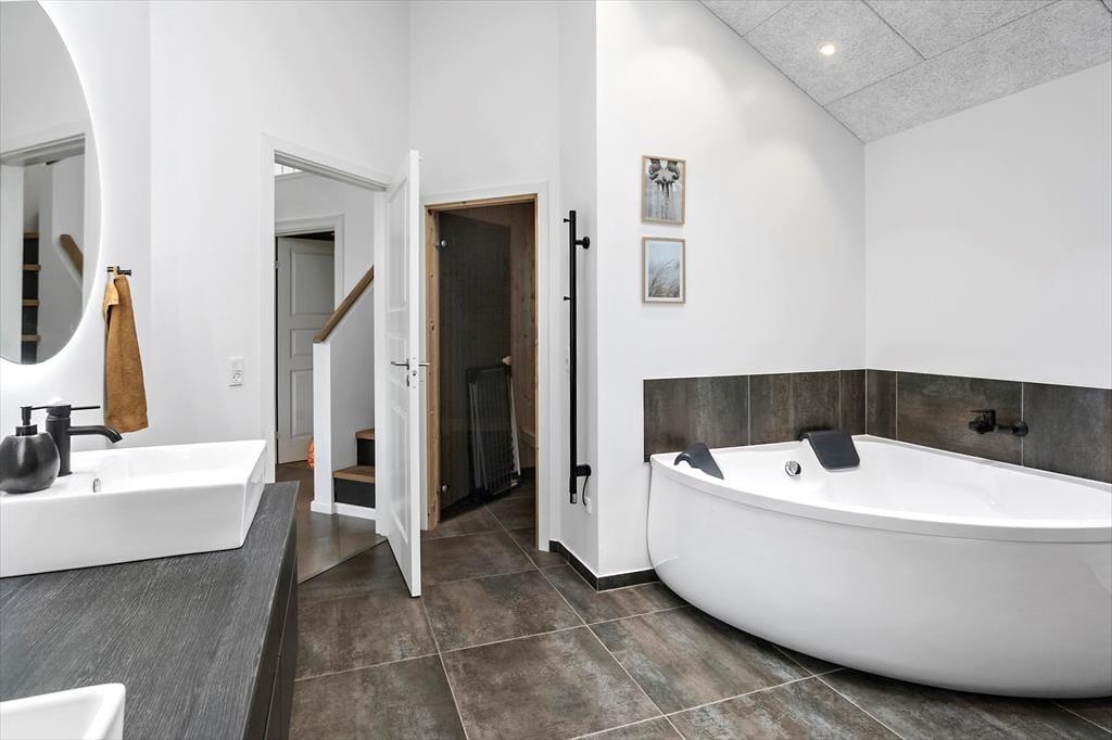 Das Ferienhaus verfügt über zwei Badezimmer: eines mit WC und Dusche, das andere mit WC, Dusche, Whirlpool und Sauna.