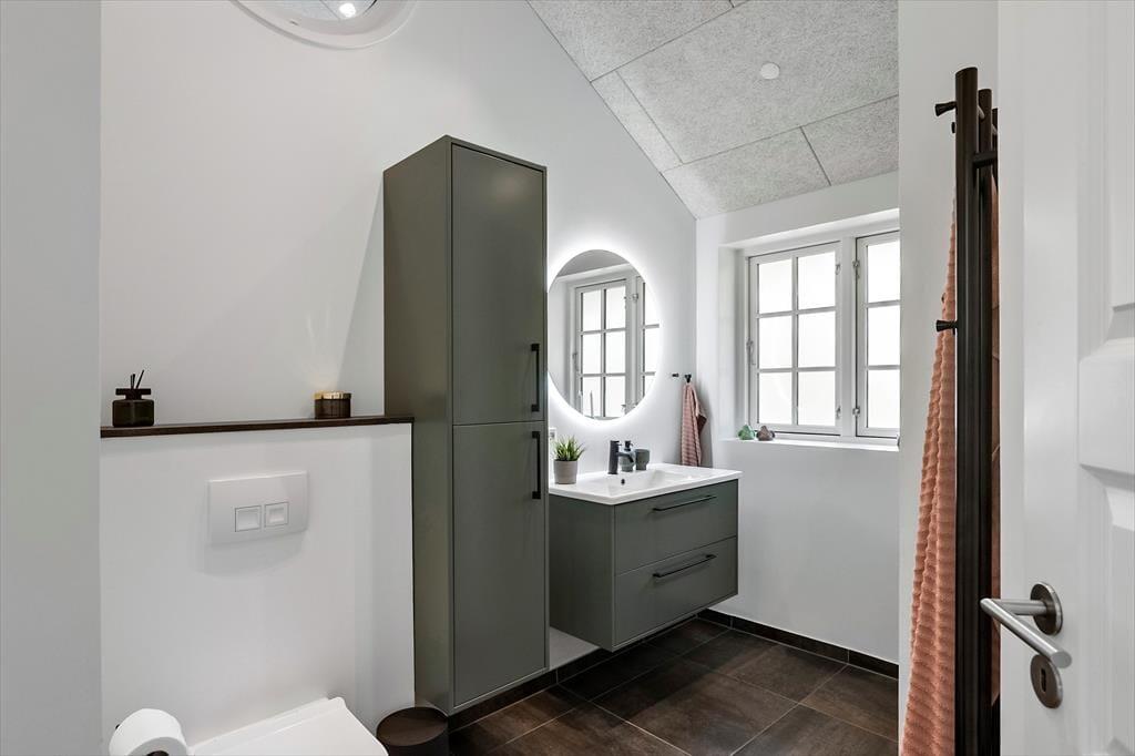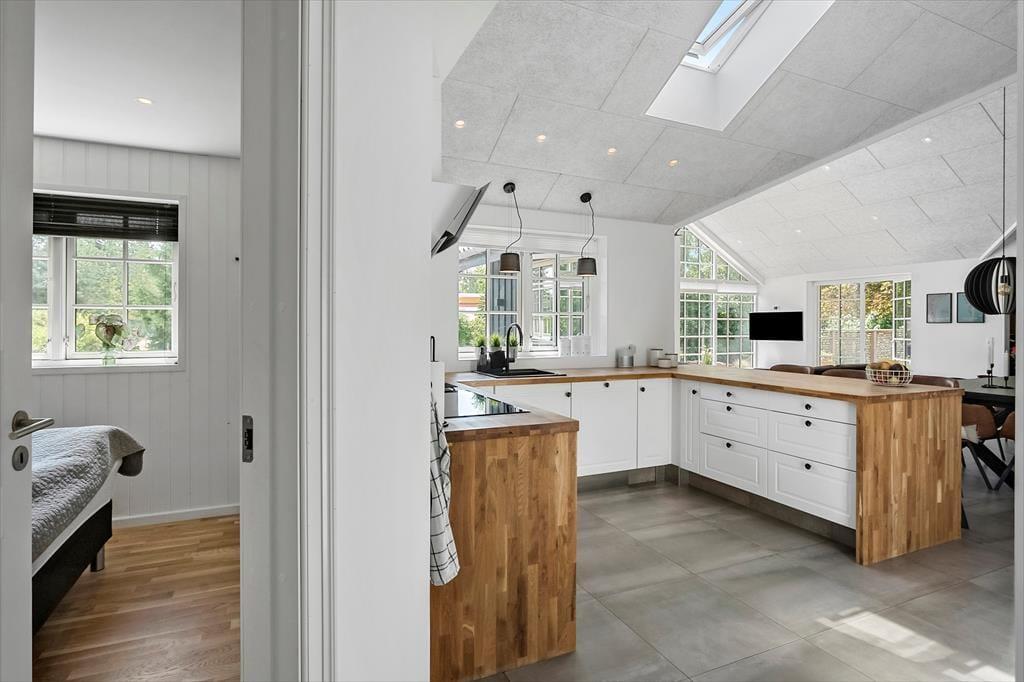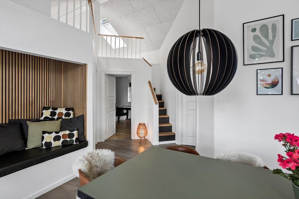 Das Herzstück des Hauses ist die helle und moderne Wohnküche mit hohen Decken und großen Fenstern, die für viel Licht sorgen. Es gibt sowohl einen Essbereich als auch eine gemütliche Sofaecke mit direktem Zugang zur schönen Terrasse. Das Wohnzimmer verfügt außerdem über eine charmante Nische, die zum Entspannen einlädt.