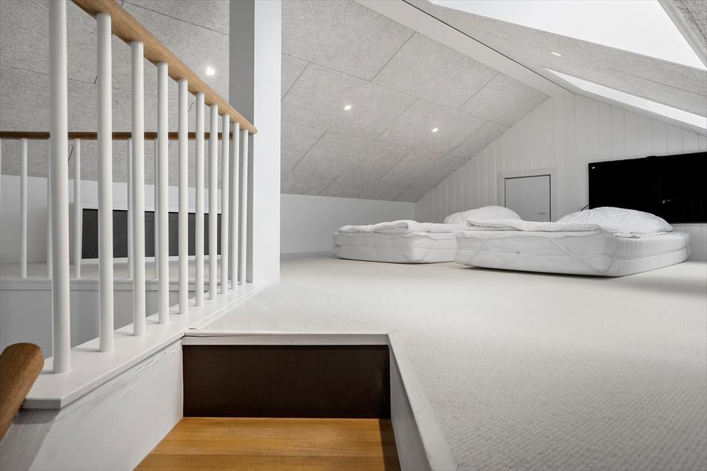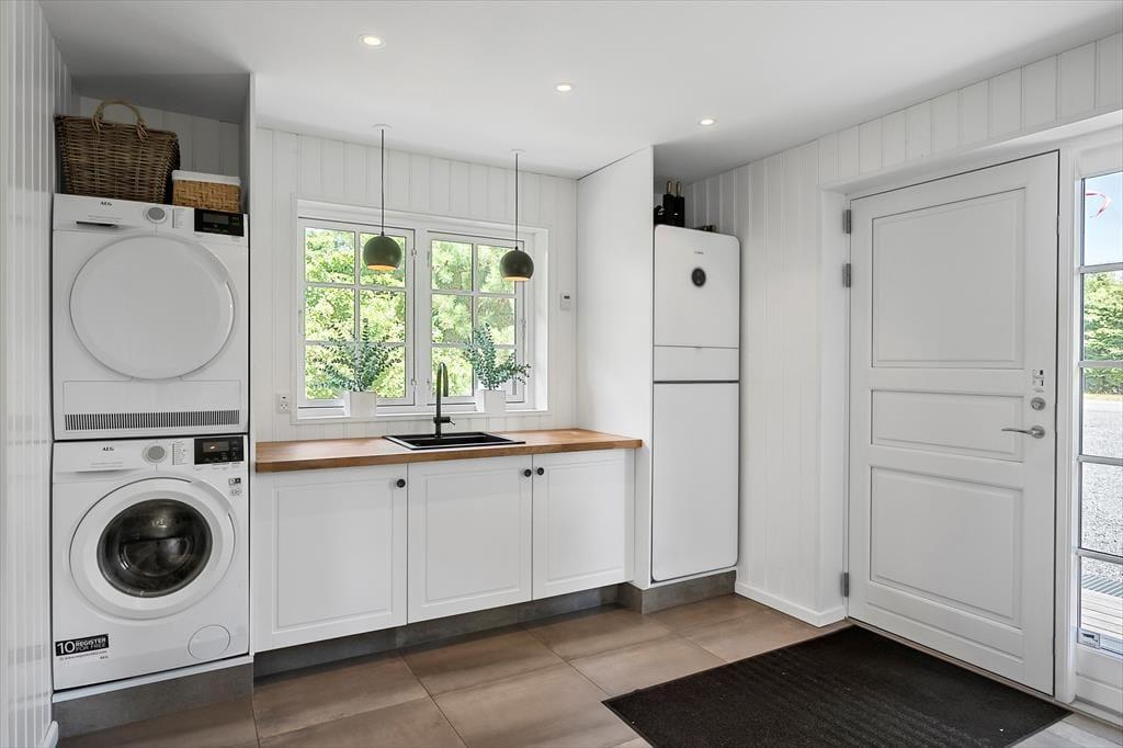 Dieses schöne Ferienhaus bietet folgende Ausstattung: Einen großen Hauswirtschaftsraum mit Waschmaschine und Trockner. Es gibt drei geräumige Schlafzimmer – zwei mit Doppelbetten und eines mit zwei Einzelbetten. Außerdem gibt es einen Schlafboden mit vier Matratzen, ideal für Kinder.