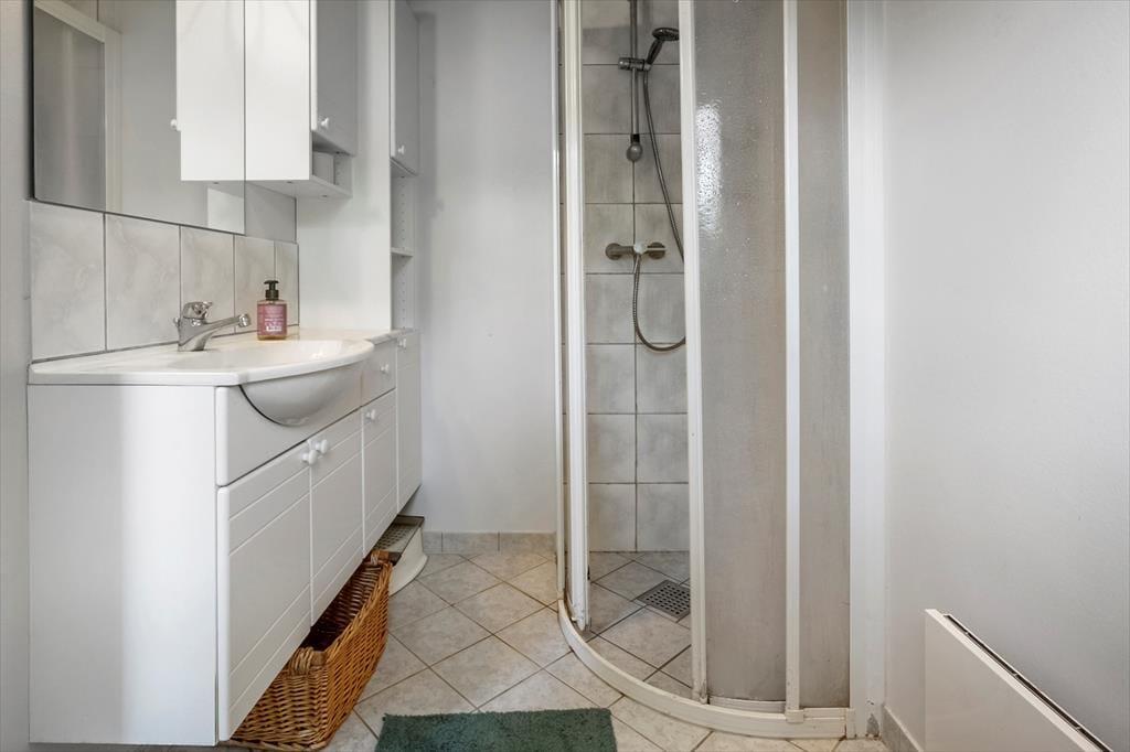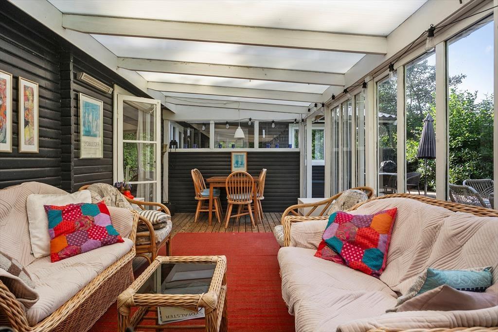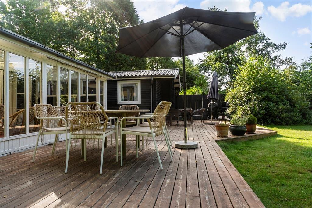 Vom Wintergarten aus gelangt man auf die Terrasse und in den Anbau. Dort befinden sich zwei Schlafplätze mit je einem Doppelbett. Das Ferienhaus verfügt über ein Badezimmer mit WC, Dusche und Waschbecken.
