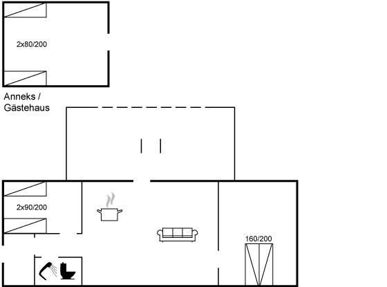 Die Schlafplätze verteilen sich auf 3 Zimmer: 1 mit Doppelbett und 2 mit je 2 Einzelbetten. Das eine Schlafzimmer mit Einzelbetten befindet sich him Gästehaus. Darüber hinaus gibt es 1 Kinderbett.
