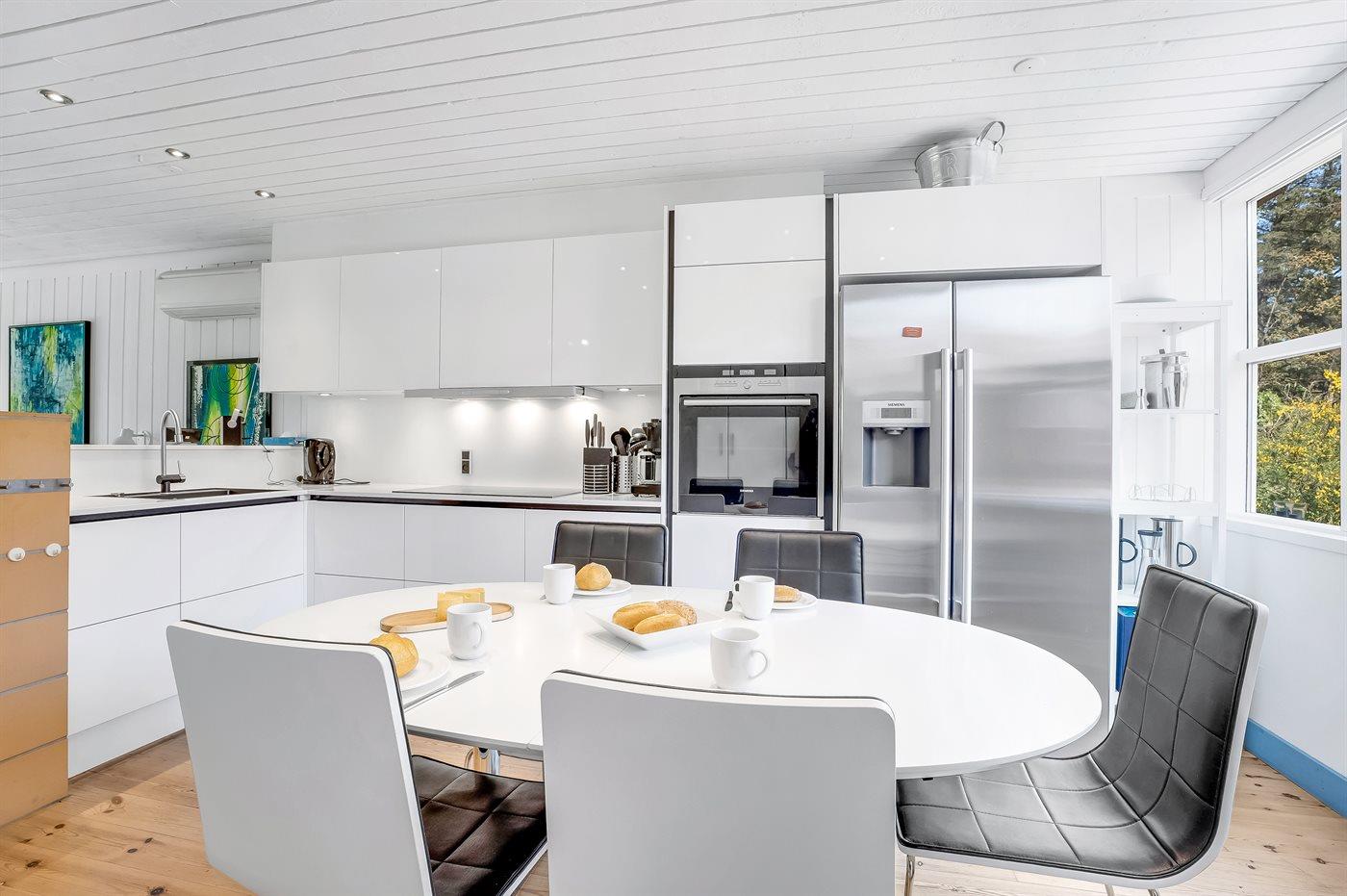 Die Küche ist mit amerikanischem Kühlschrank ausgestattet. Außerdem gibt es 4 Induktions-Kochzonen, Minibackofen, Umluftofen, Mikrowelle sowie Geschirrspüler.