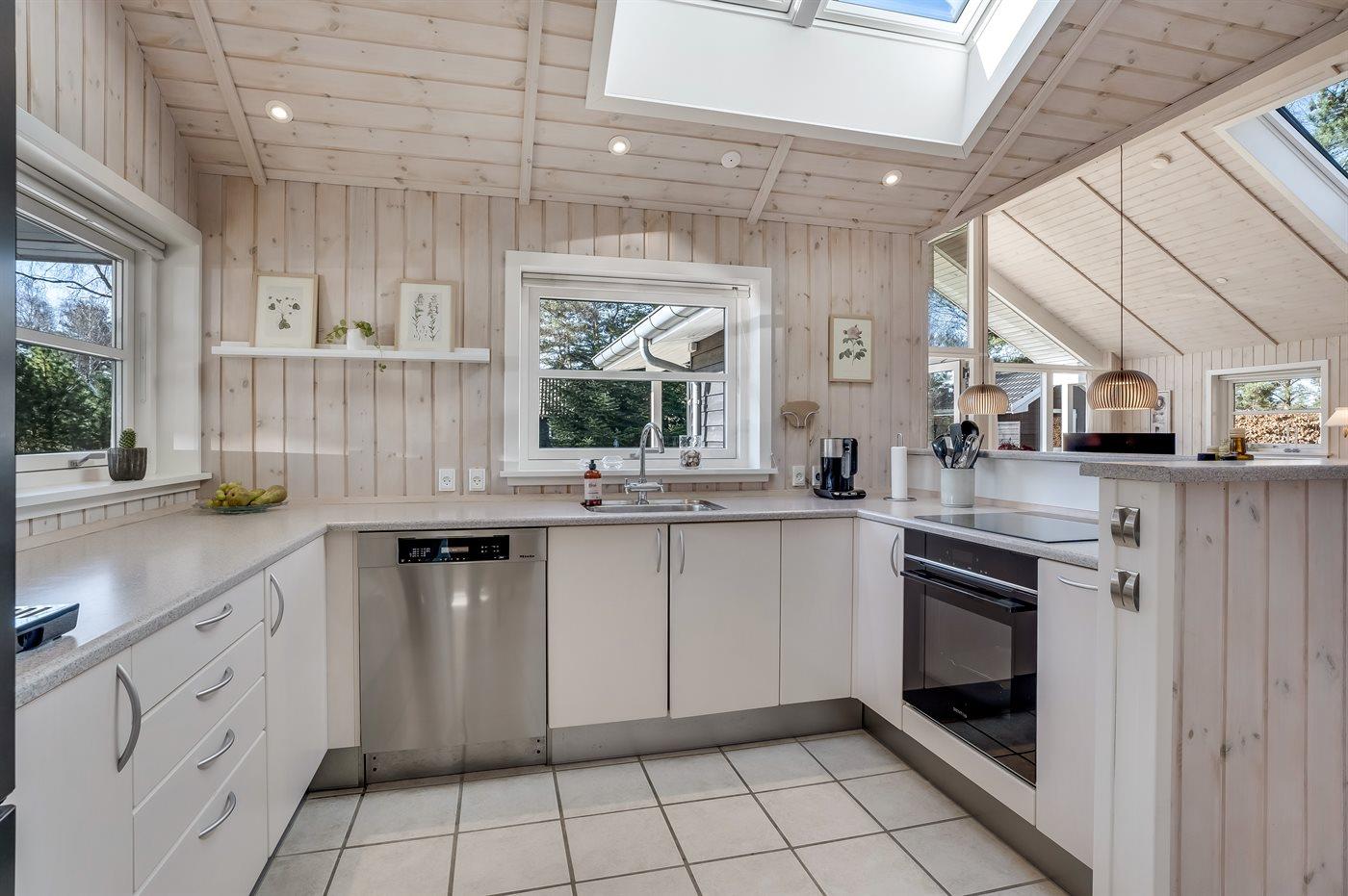 Die Küche ist mit Kühlschrank ausgestattet. Außerdem gibt es 4 Keramik-Kochfelder, Umluftofen sowie Geschirrspüler.