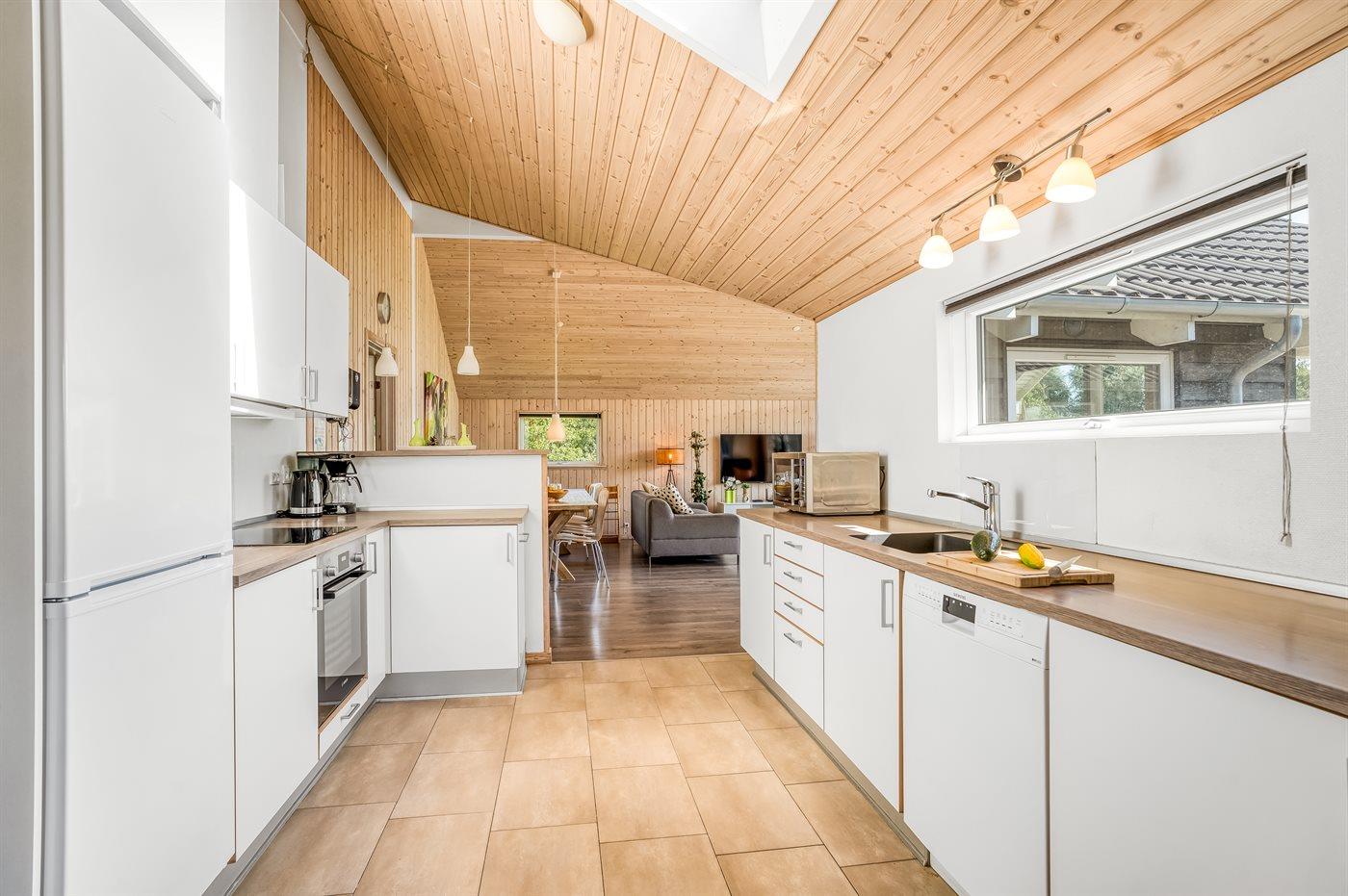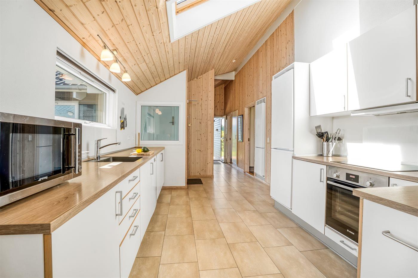 Die gut ausgestattete Küche bietet viel Platz und enthält unter anderem einen großen Kühlschrank, einen Gefrierschrank und eine Geschirrspülmaschine. Das gesamte Haus ist mit Fußbodenheizung ausgestattet – auch die Badezimmer – und wird umweltfreundlich mit Erdwärme beheizt.