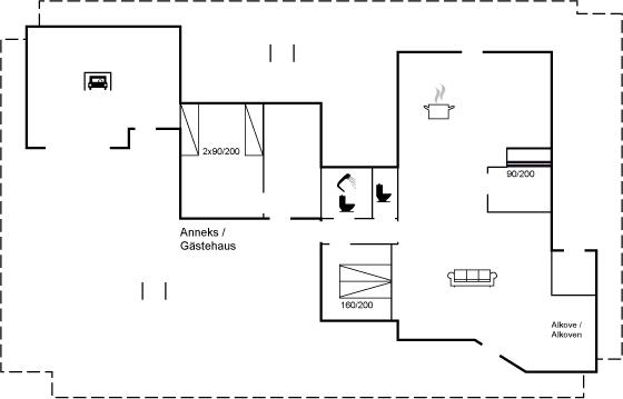 Die Schlafplätze verteilen sich auf 3 Schlafräume. 2 Schlafplätze in einem Doppelbett. 2 Schlafplätze in Einzelbetten. 2 Schlafplätze in einem Etagenbett. 2 von diesen Schlafplätzen befinden sich im Gästehaus. Ferner steht ein Kinderbett zur Verfügung.