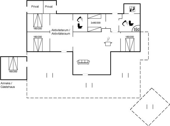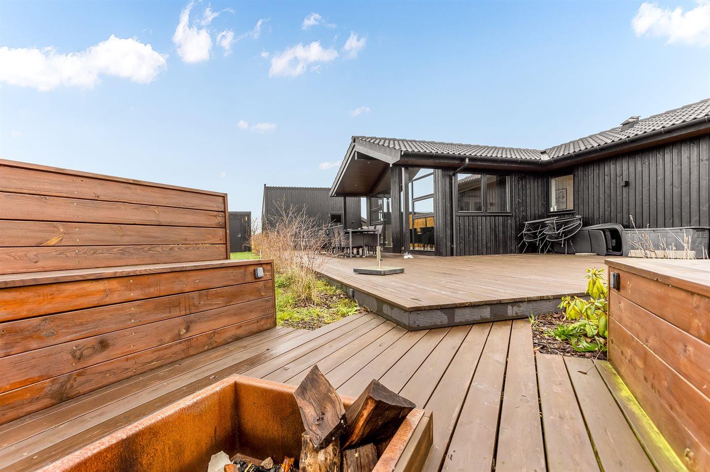 Die Ferienunterkunft liegt auf einem 1200 m² großen Gartengrundstück. Das Grundstück ist eingezäunt. Die Entfernung zum Meer beträgt 900 m. Die nächste Einkaufsmöglichkeit liegt 800 m entfernt. In einem Abstand von 1500 m gibt es einen Golfplatz. Es steht ein offenes Terrassenareal zur Verfügung. Außerdem gibt es überdachte Terrasse. Trampolin. Die Entfernung zu einem Spielplatz beträgt 800 m.Lagerfeuerstelle. Außendusche. Es steht ein Grill zur Verfügung. Parkplatz auf dem Grundstück.