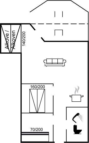Die Schlafplätze verteilen sich auf 2 Schlafräume. 2 Schlafplätze in einem Doppelbett. 2 Schlafplätze in einem Etagenbett.2 Schlafplätze im Alkoven.
