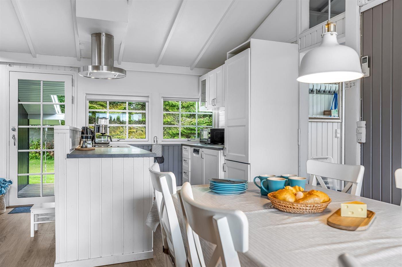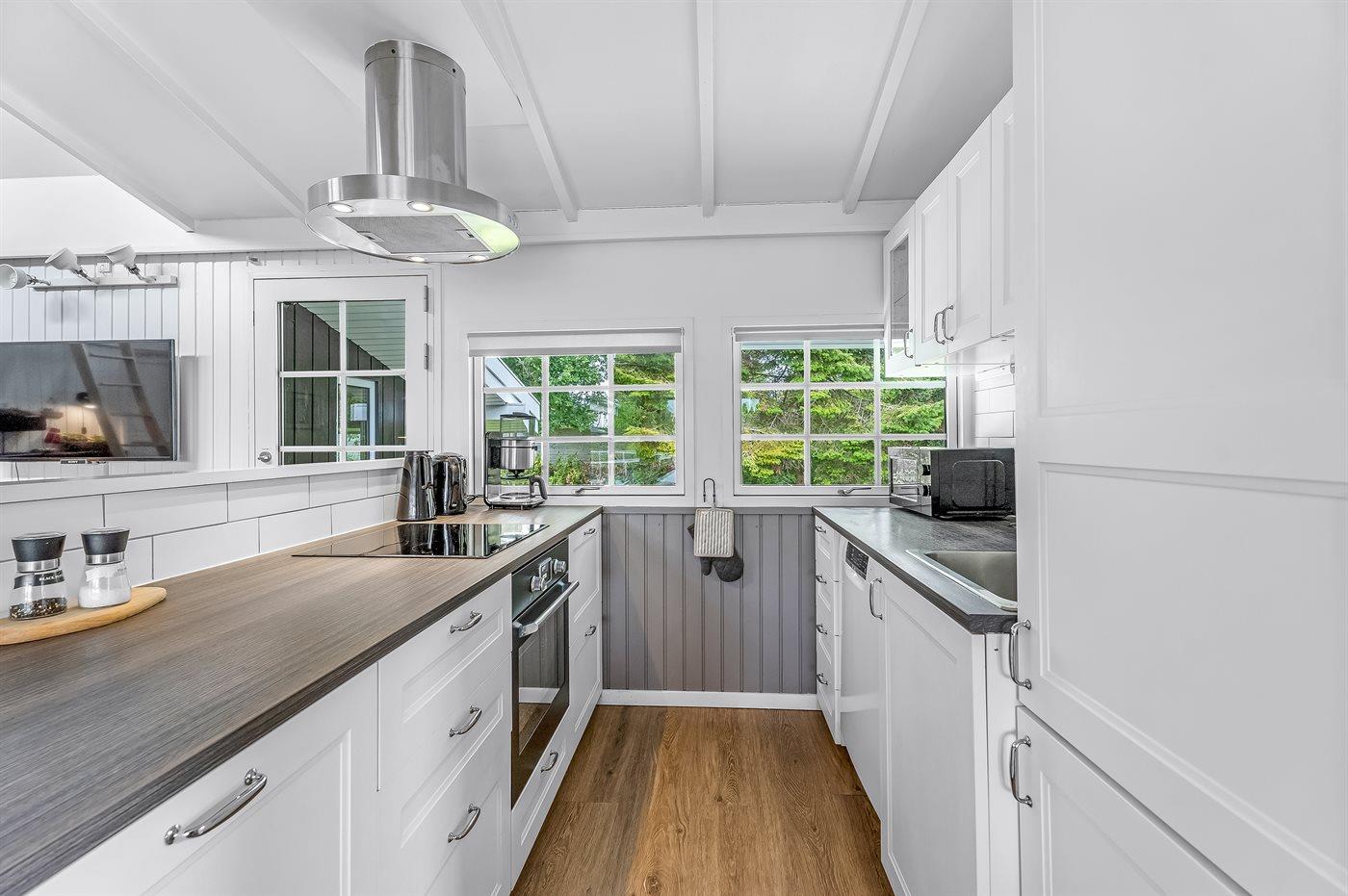 Der offene Küche ist mit u. a. Kühl-/Gefrierschrank, Herd mit Ceran-Feld und Umluftofen, Dunstabzugshaube, Mikrowelle, Geschirrspüler, Kaffeemaschine, Wasserkocher u. a. m. ausgestattet.