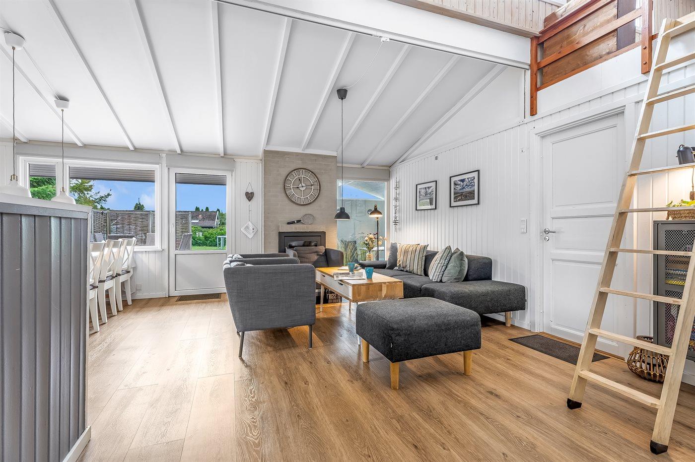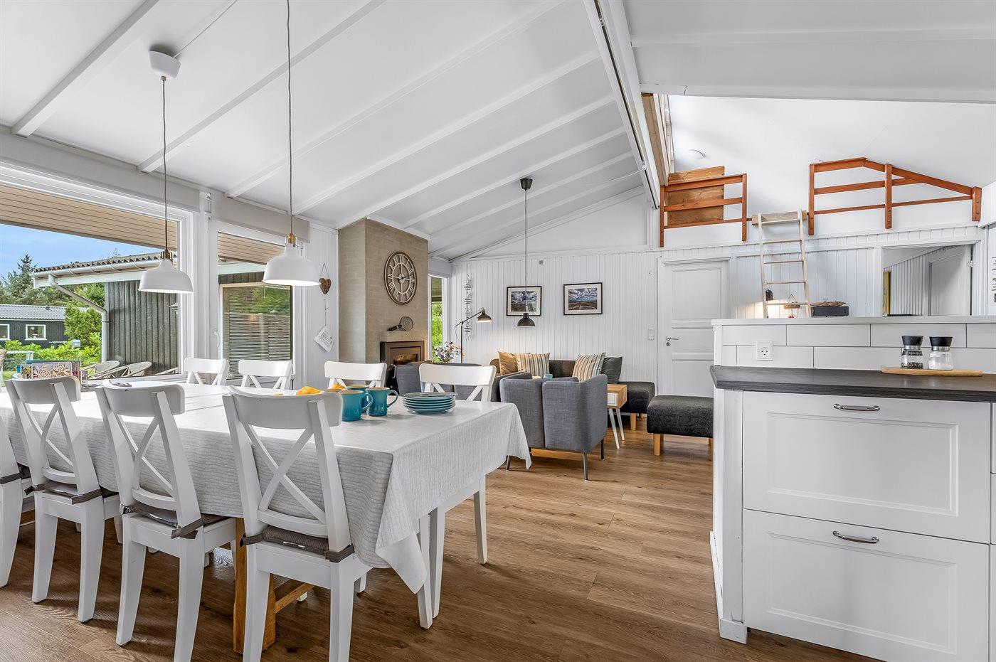 Im Wohnzimmer findest du einen Kaminofen, einen Essbereich und eine Sofagruppe.