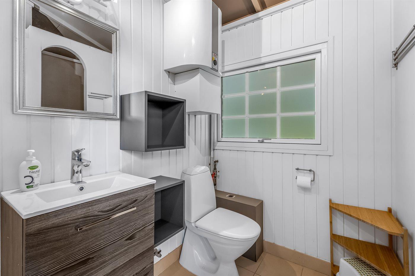 Es gibt zwei Badezimmer mit Fußbodenheizung, Duschnische und Toilette. Das Ferienhaus und der Swimmingpool werden durch zwei energieeffiziente Wärmepumpen beheizt.