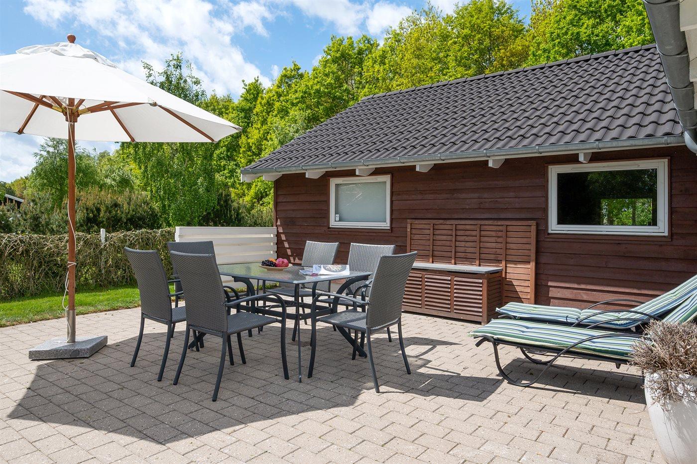 Im Außenbereich findest du mehrere schöne Terrassen, auf denen du den ganzen Tag die Sonne genießen und an milden Sommerabenden den Grill anzünden kannst. Der große Garten bietet viel Platz zum Spielen und für Ballspiele.
