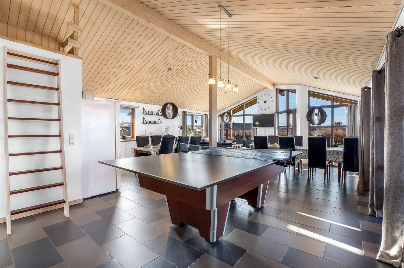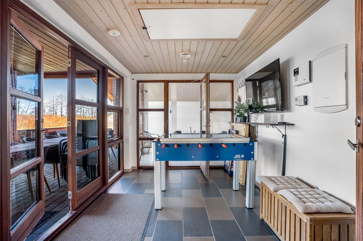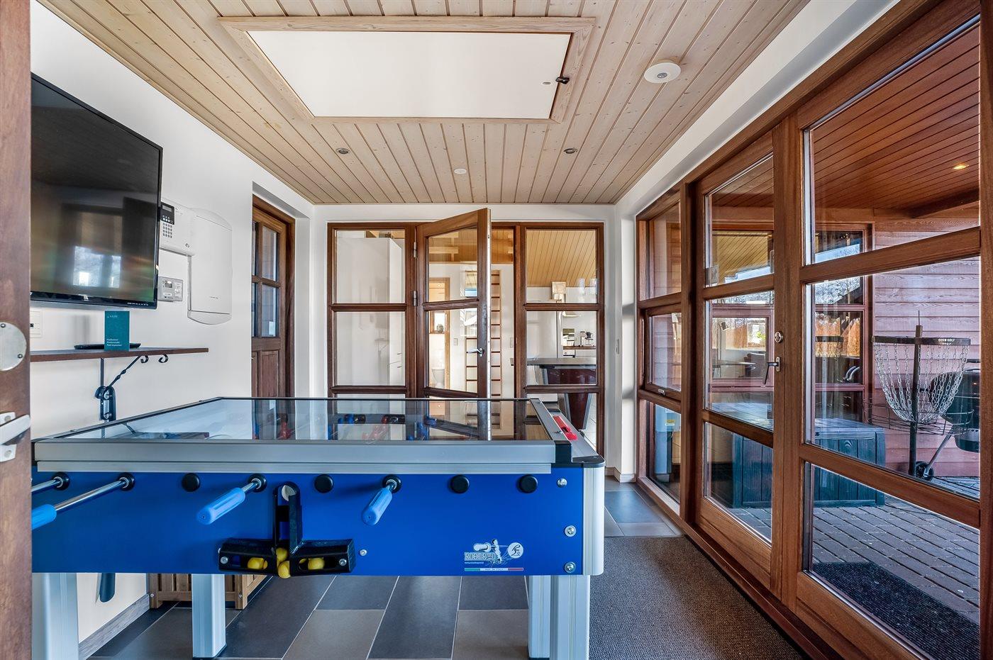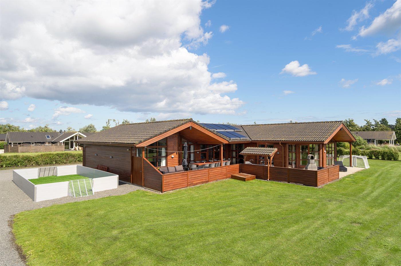 Ein schönes und familienfreundliches Ferienhaus mit Innenpool und Whirlpool sowie einem Angebot aus verschiedenen Indoor-Aktivitäten. Das Ferienhaus bietet mit einem Fußballtor und einem Minigolfplatz außerdem gute Möglichkeiten für Outdoor-Aktivitäten. Das Ferienhaus ist ein Niedrigenergiehaus, was den Verbrauch senkt. Übrigens: 4 der Schlafplätze befinden sich im offenen Obergeschoss des Hauses.