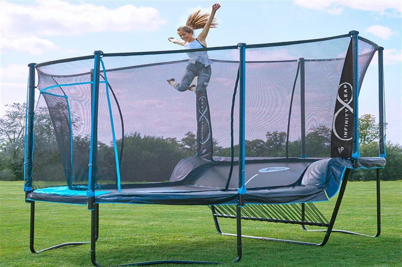 • Doppeltrampolin, Fußballtor und Sandkasten für Kinder