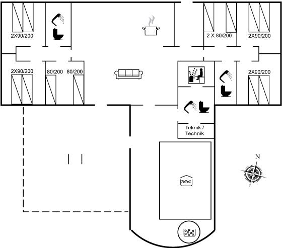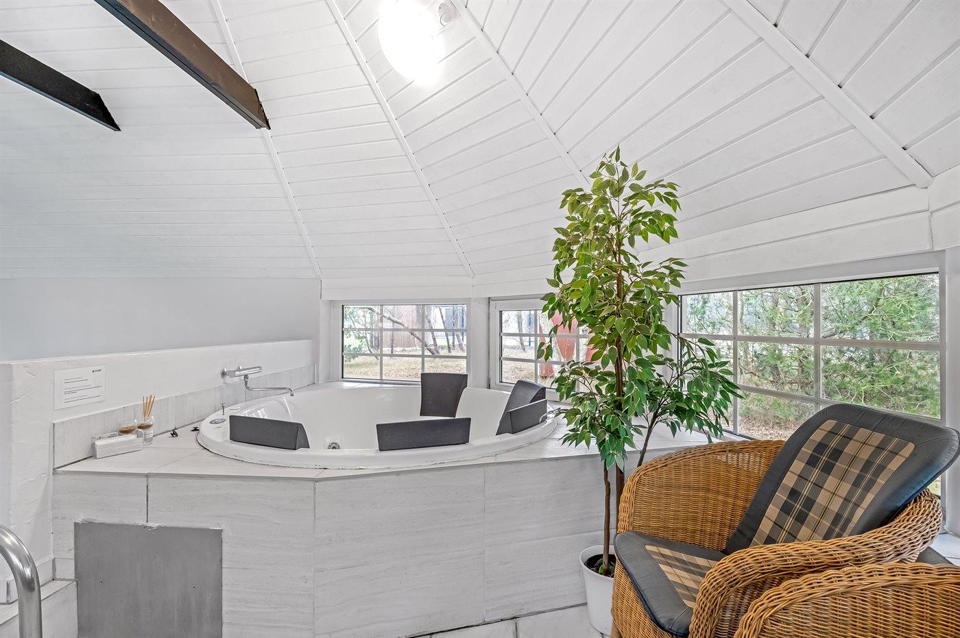 Es gibt 3 Badezimmer mit Dusche und 3 Toiletten. Fußbodenheizung ist vorhanden. Entspannungsmöglichkeiten gibt es im Innen-Whirlpool für 6 Personen oder in der Sauna für 7 Personen.