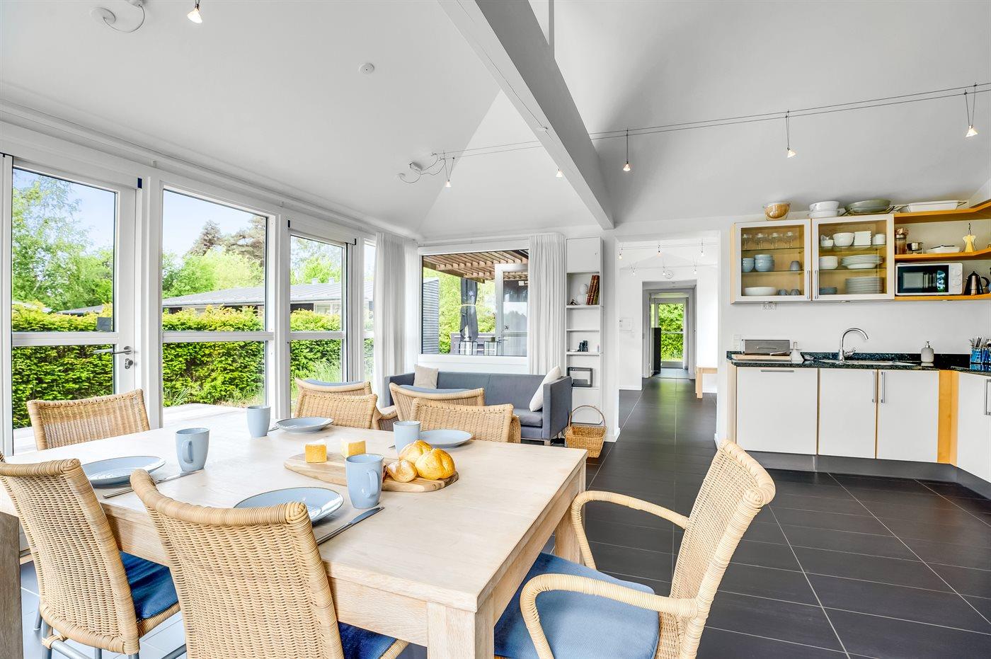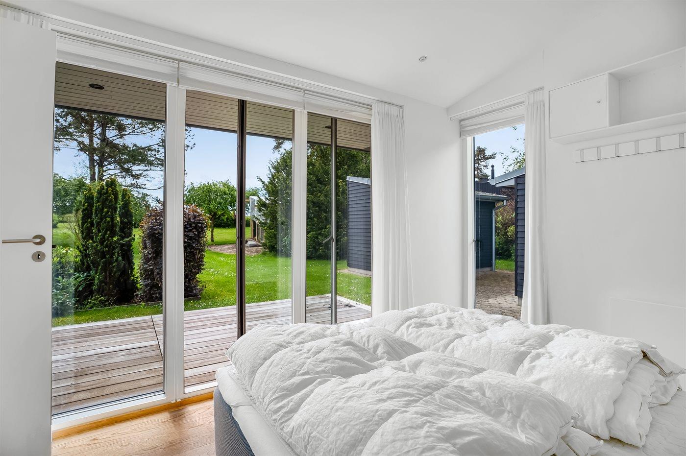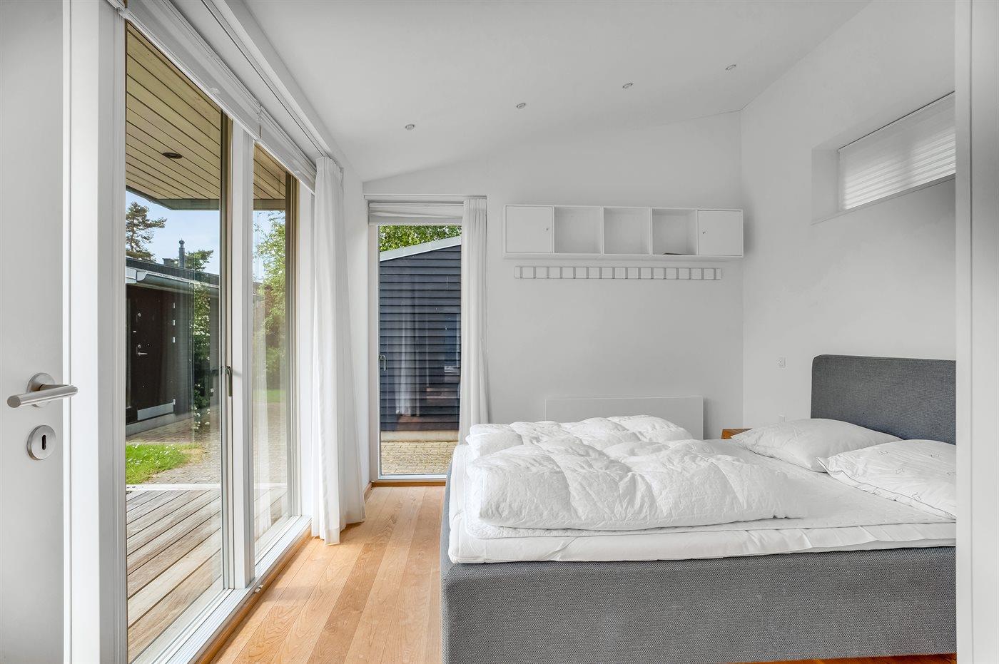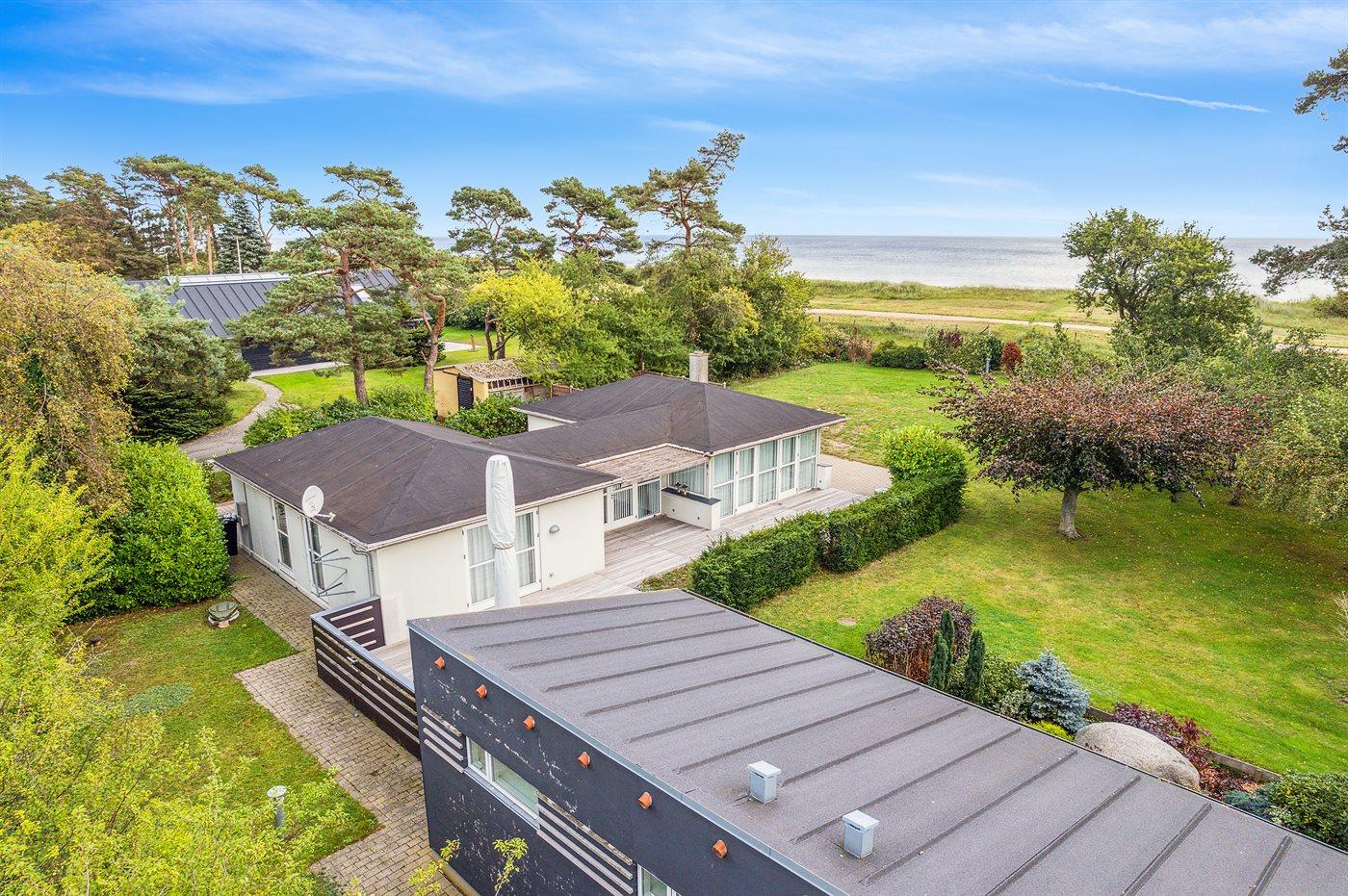 Der große Garten mit alten Bäumen und Sträuchern öffnet sich direkt zum Strand hin. Ein perfekter Ort für Familien und Freunde, die Sport, Entspannung und gemeinsame Zeit schätzen. Das Interieur von Haupthaus und Gästehaus ist in ruhigen Blau- und Weißtönen gehalten – typisch dänisches Design, schlicht und hochwertig.