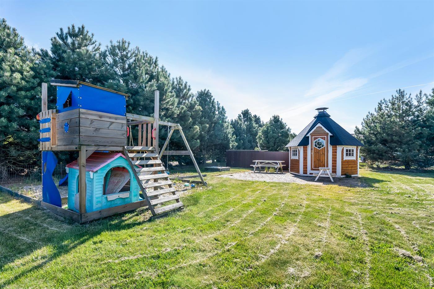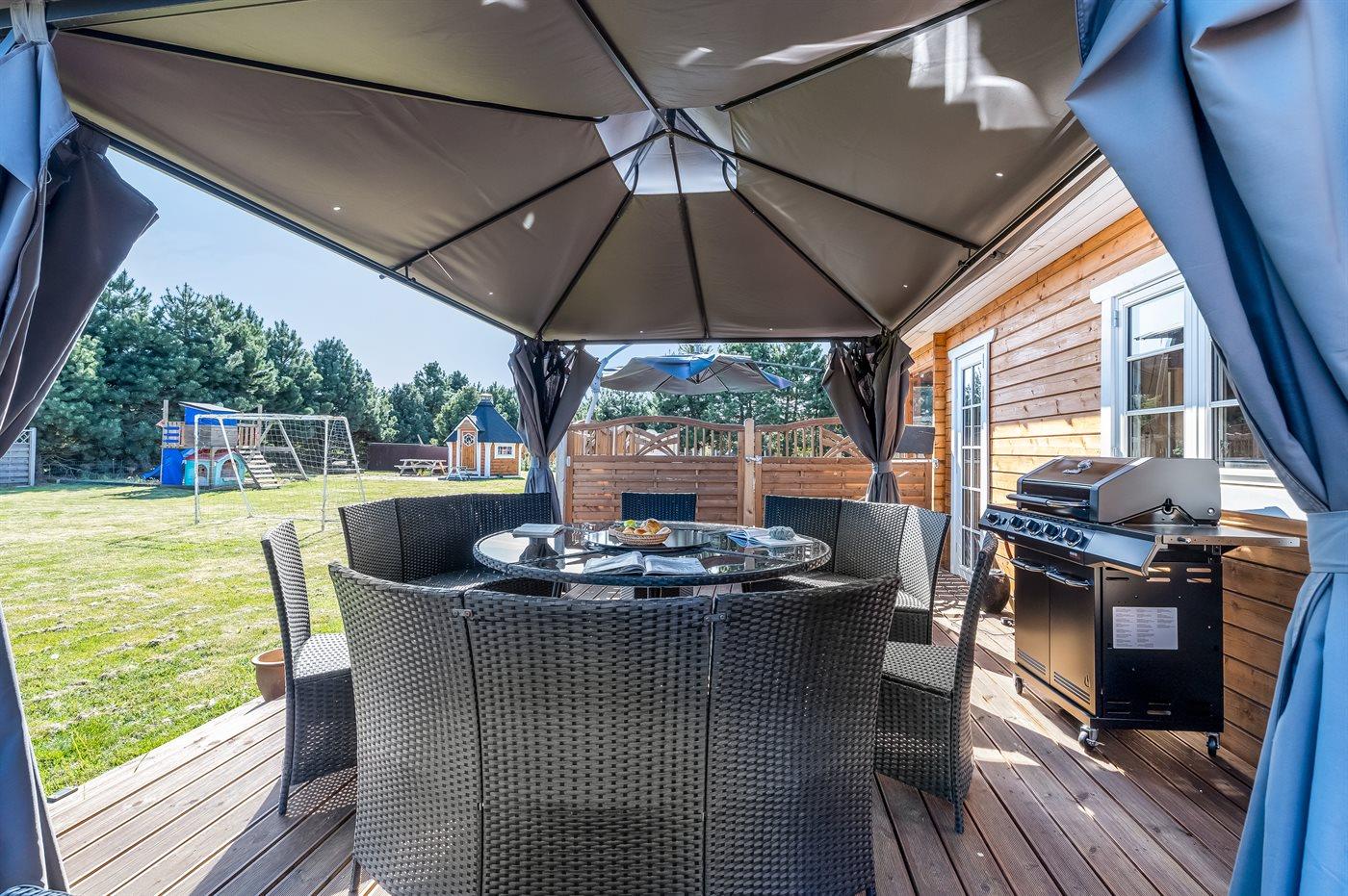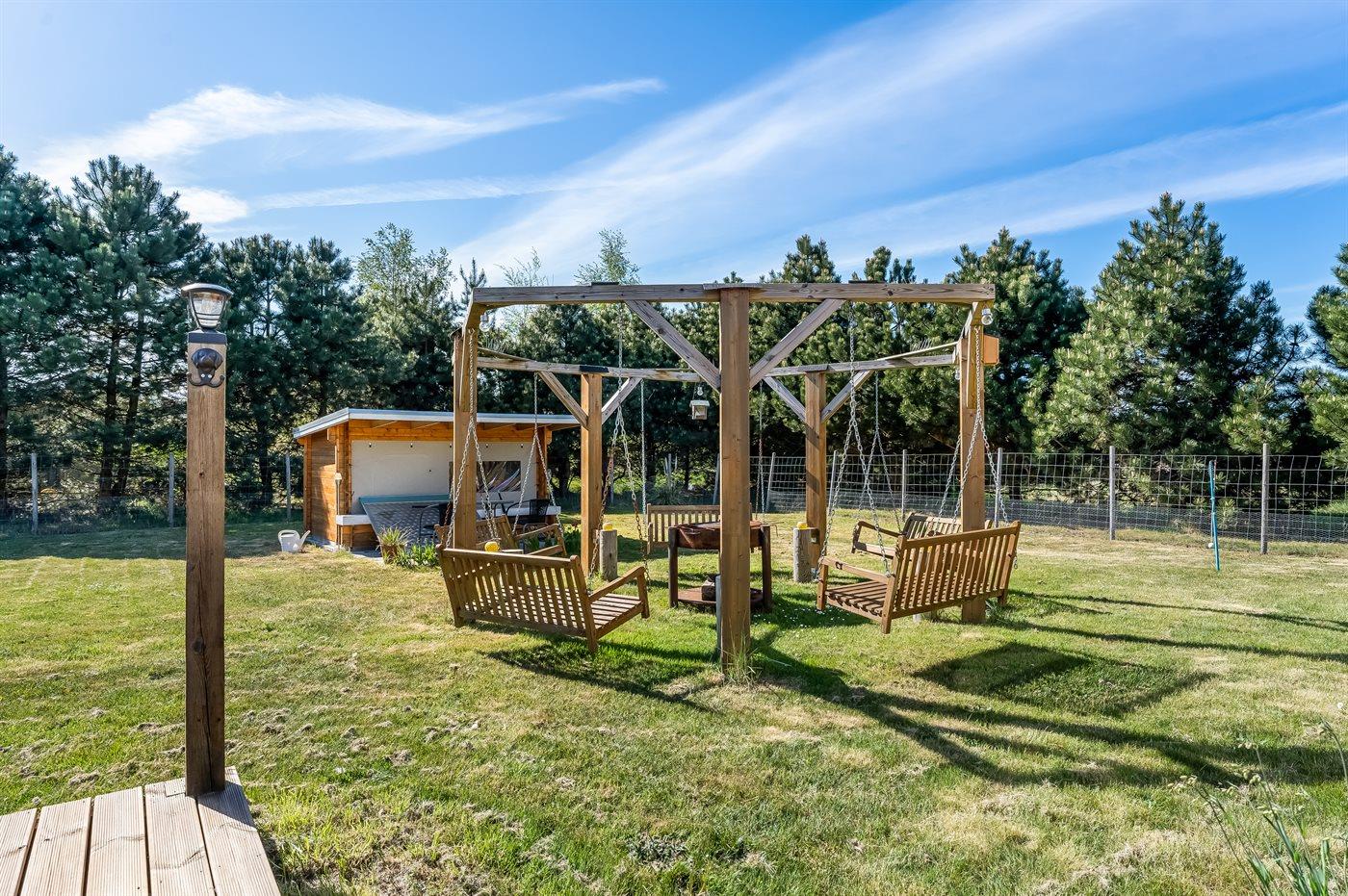 Willkommen in einem Ferienhaus, das sich in vielerlei Hinsicht positiv von der Masse abhebt. Das Haus ist so eingerichtet, dass es viele gemütliche Bereiche sowohl für Klein als auch Groß bietet, gleichzeitig spürt man das Beisammensein mit den anderen, die im Urlaub sind. Wenn man das Leben im Freien mag, bietet dieses Haus wirklich schöne Lösungen für Gemeinschaft und Gemütlichkeit wie z. B. dem großen Außengrill mit Hängesofas rundherum, dem Outdoor-Whirlpool, dem Spielplatz und dem schönen Grillhaus.