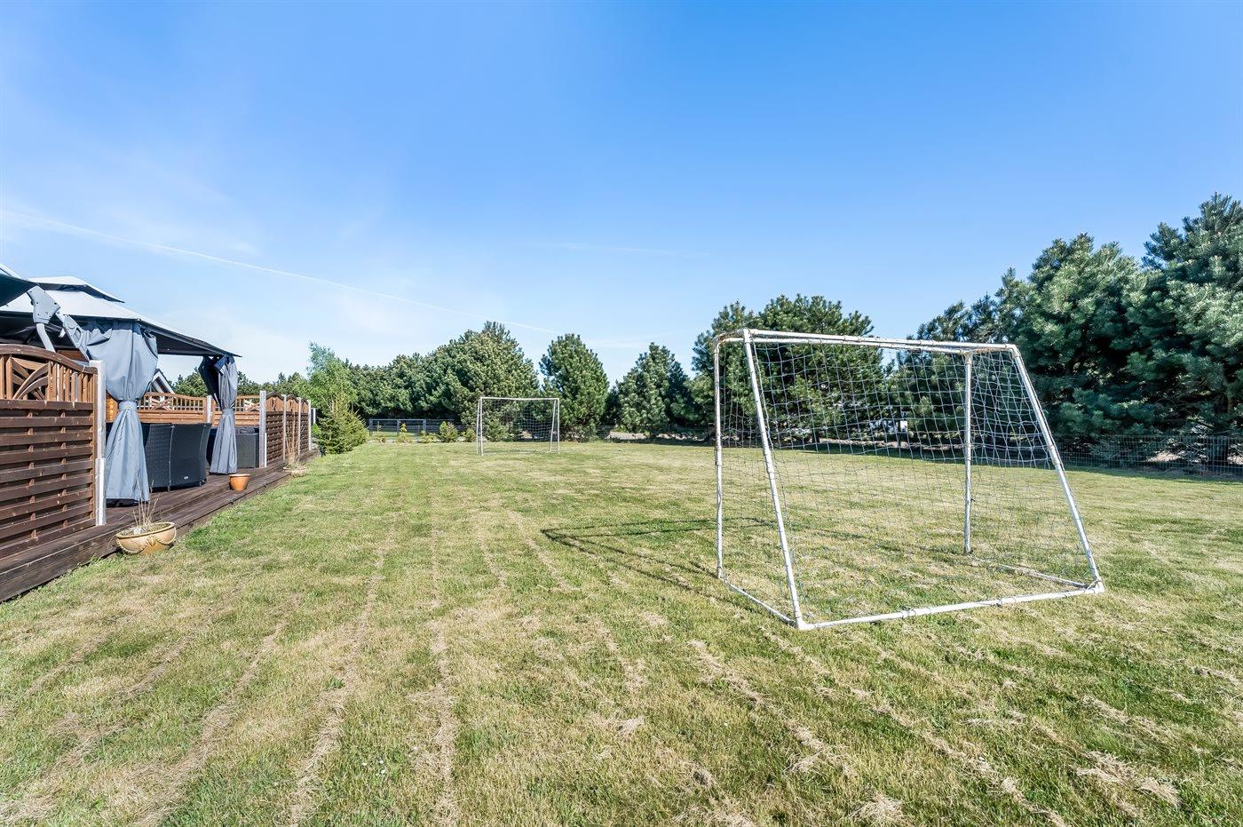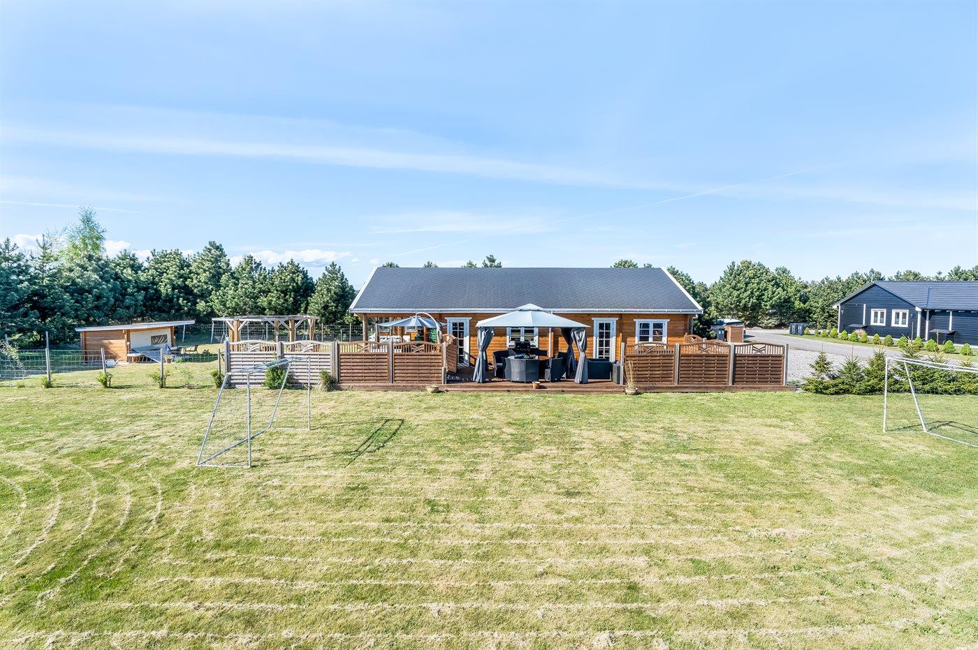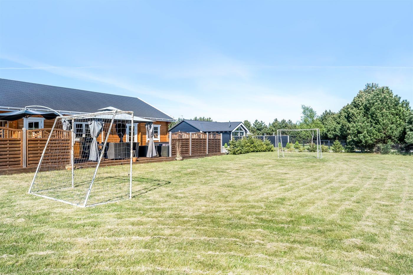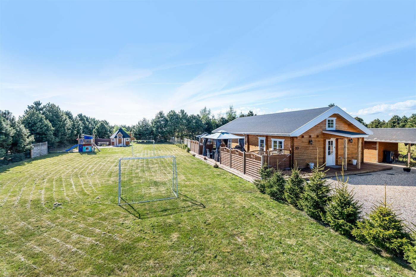Die Ferienunterkunft liegt auf einem 1700 m² großen Naturgrundstück. Das Grundstück ist eingezäunt. Die Entfernung zum Meer beträgt 1450 m. Die nächste Einkaufsmöglichkeit liegt 1100 m entfernt. In einem Abstand von 2000 m gibt es einen Golfplatz. Es steht ein offenes Terrassenareal zur Verfügung. Schaukel. Sandkasten. Kinderspielhaus. Spielturm.Wippe. Fußballtor. Windschutzhütte.An Sommerabenden sorgt der Außenkamin für eine gemütliche Atmosphäre. Es steht ein Grill zur Verfügung. Es ist ein Ladestecker für Elektroautos installiert. Mit einer Ladeleistung von 11 kW. Parkplatz auf dem Grundstück.