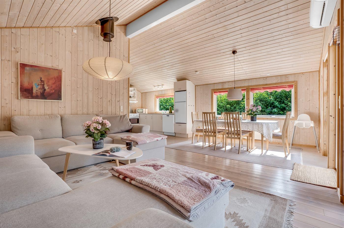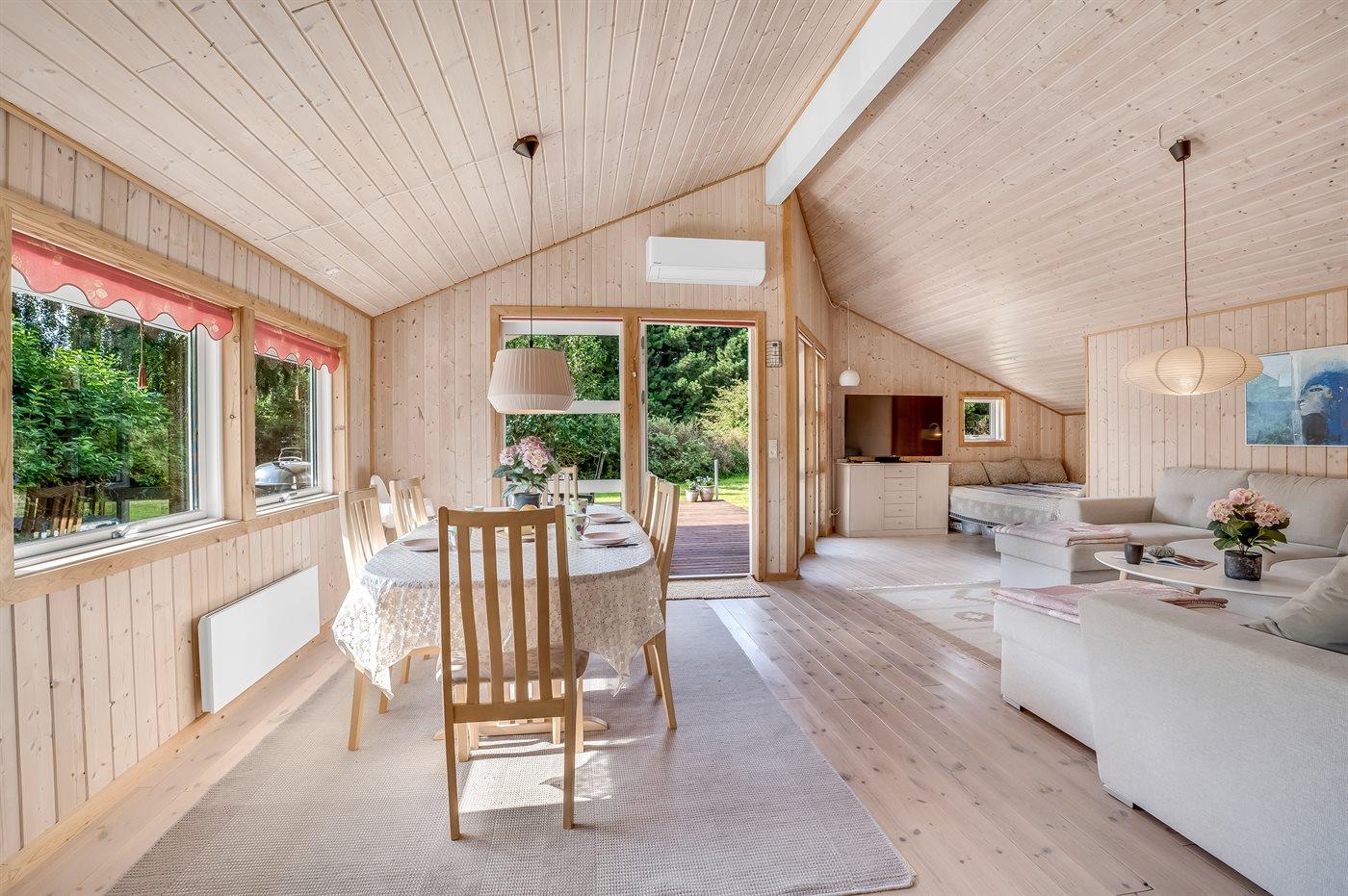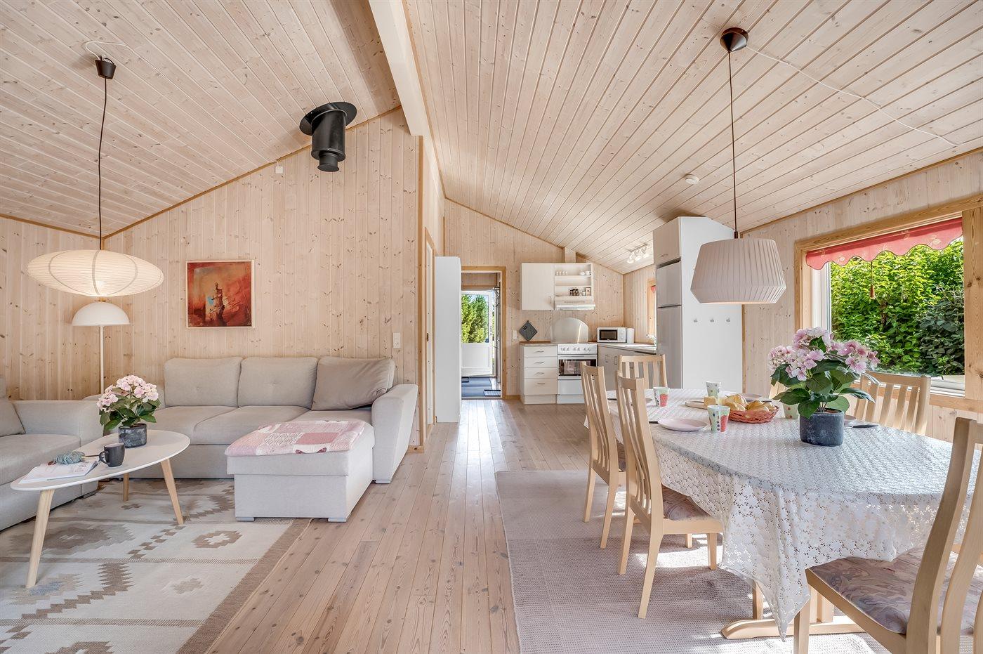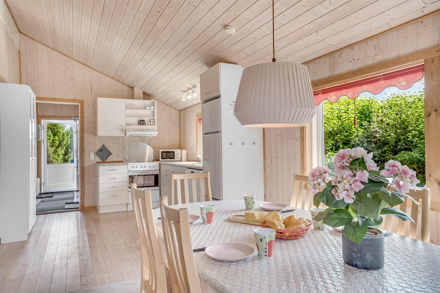 Das Haus ist hell und freundlich eingerichtet mit zwei guten Schlafzimmern, einem Badezimmer sowie einer offenen Küche in Verbindung mit dem Ess- und Wohnzimmer. Im Wohnzimmer gibt es eine gemütliche Alkove, in der die Kinder gerne übernachten werden. Hier gibt es auch einen Ausgang zu einer schönen Holzterrasse mit komfortablen Gartenmöbeln und Grill.