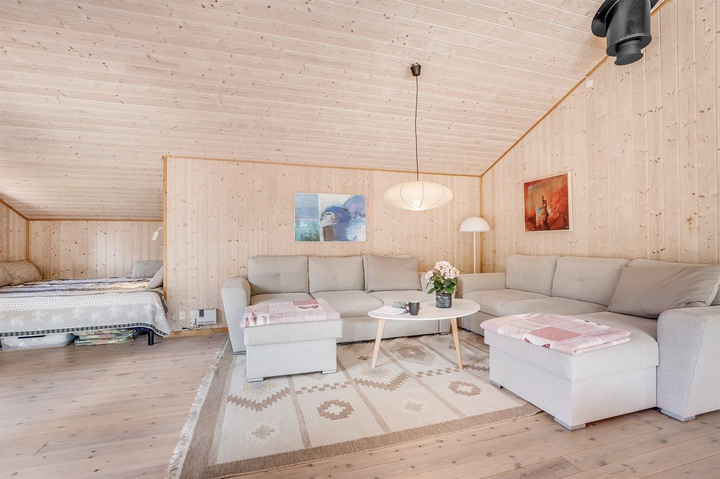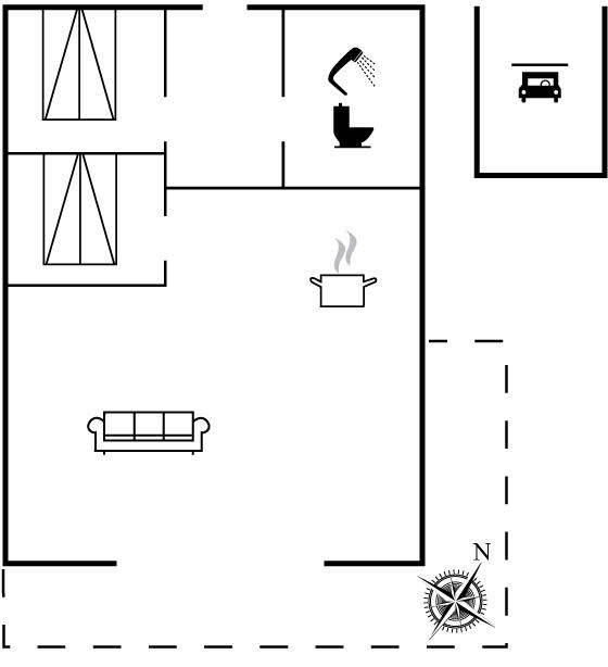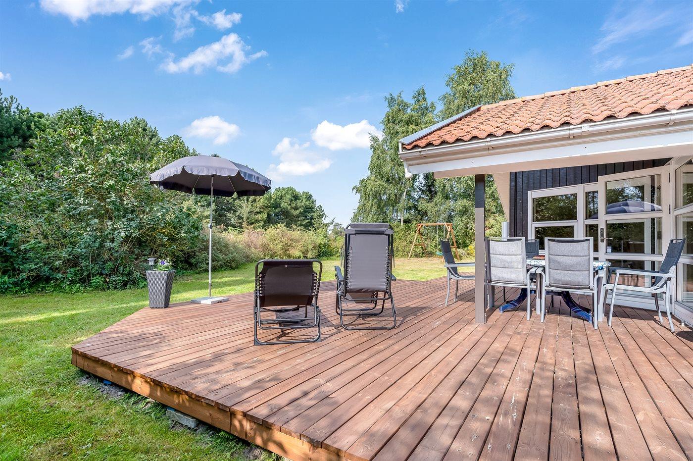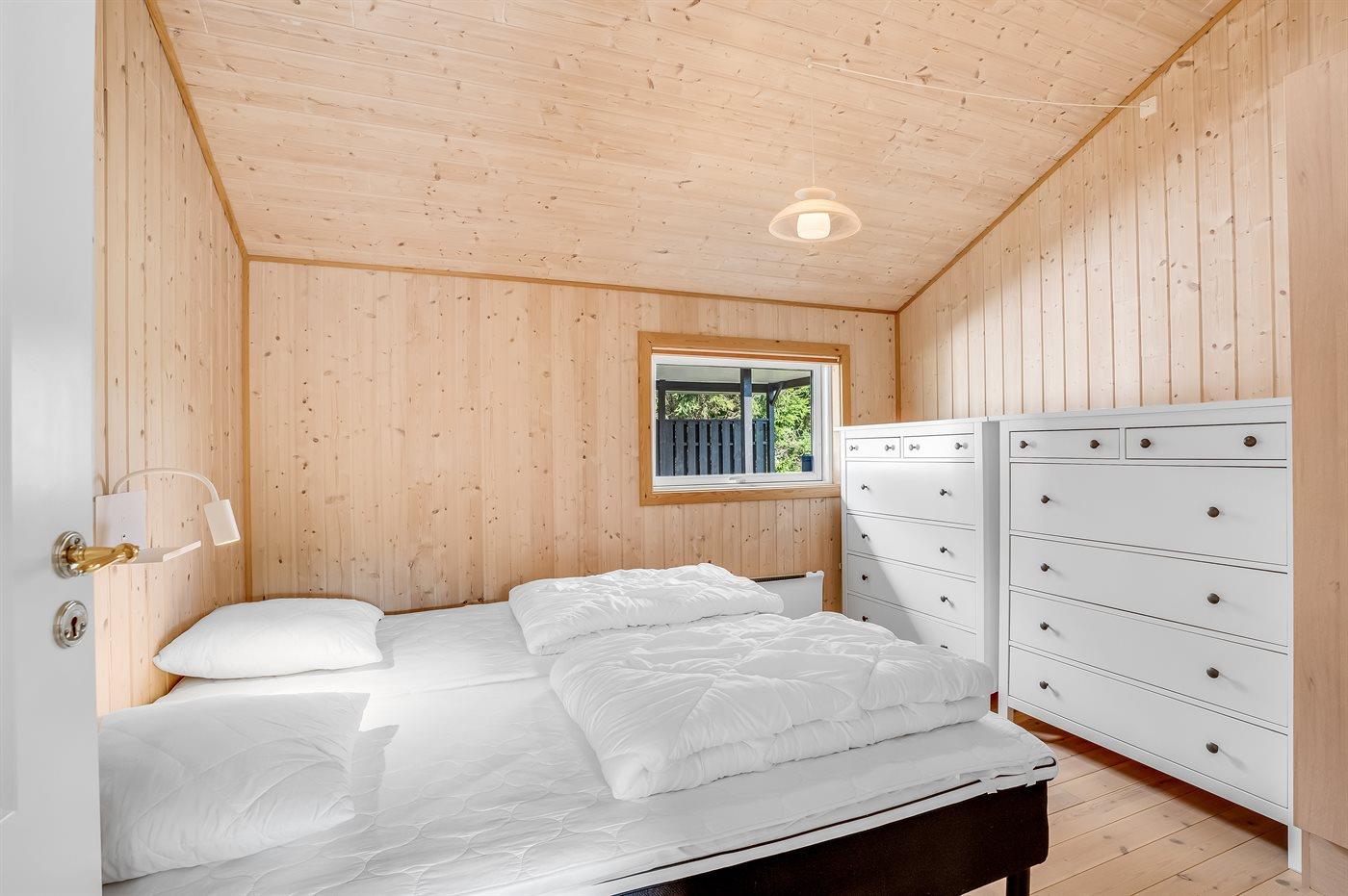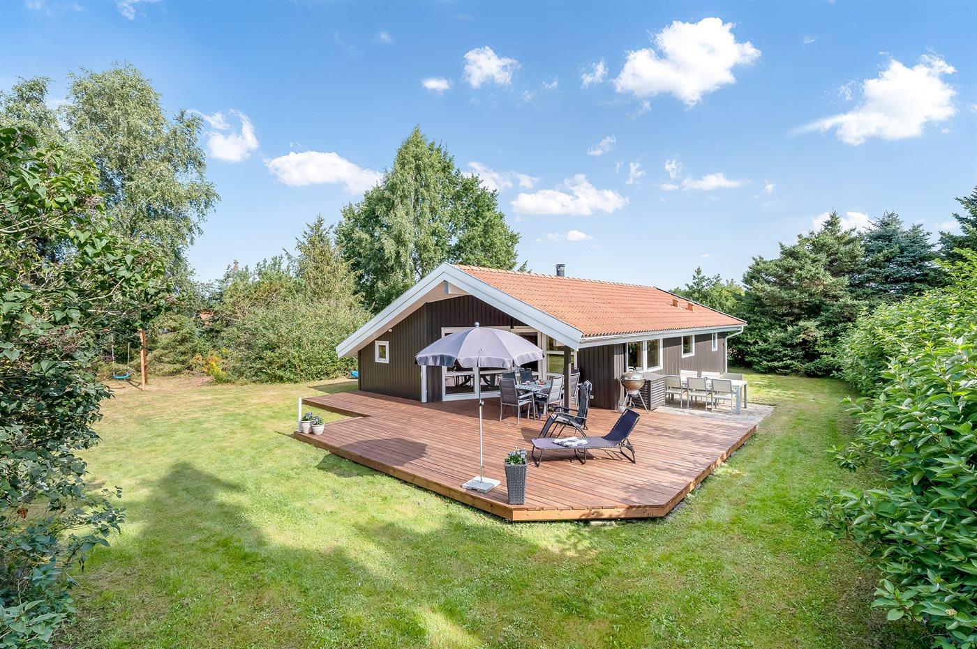 Das Haus ist hell und freundlich eingerichtet mit zwei guten Schlafzimmern, einem Badezimmer sowie einer offenen Küche in Verbindung mit dem Ess- und Wohnzimmer. Im Wohnzimmer gibt es eine gemütliche Alkove, in der die Kinder gerne übernachten werden. Hier gibt es auch einen Ausgang zu einer schönen Holzterrasse mit komfortablen Gartenmöbeln und Grill.
