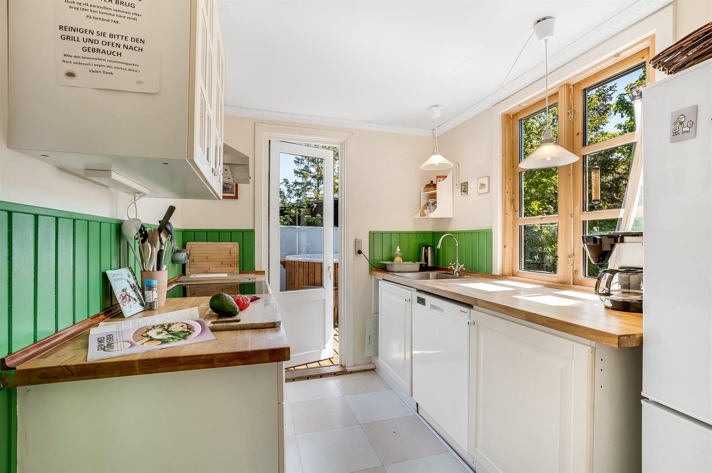 Die Küche ist mit Kühlschrank ausgestattet. Außerdem gibt es 4 Keramik-Kochfelder, Umluftofen, Mikrowelle sowie Geschirrspüler.