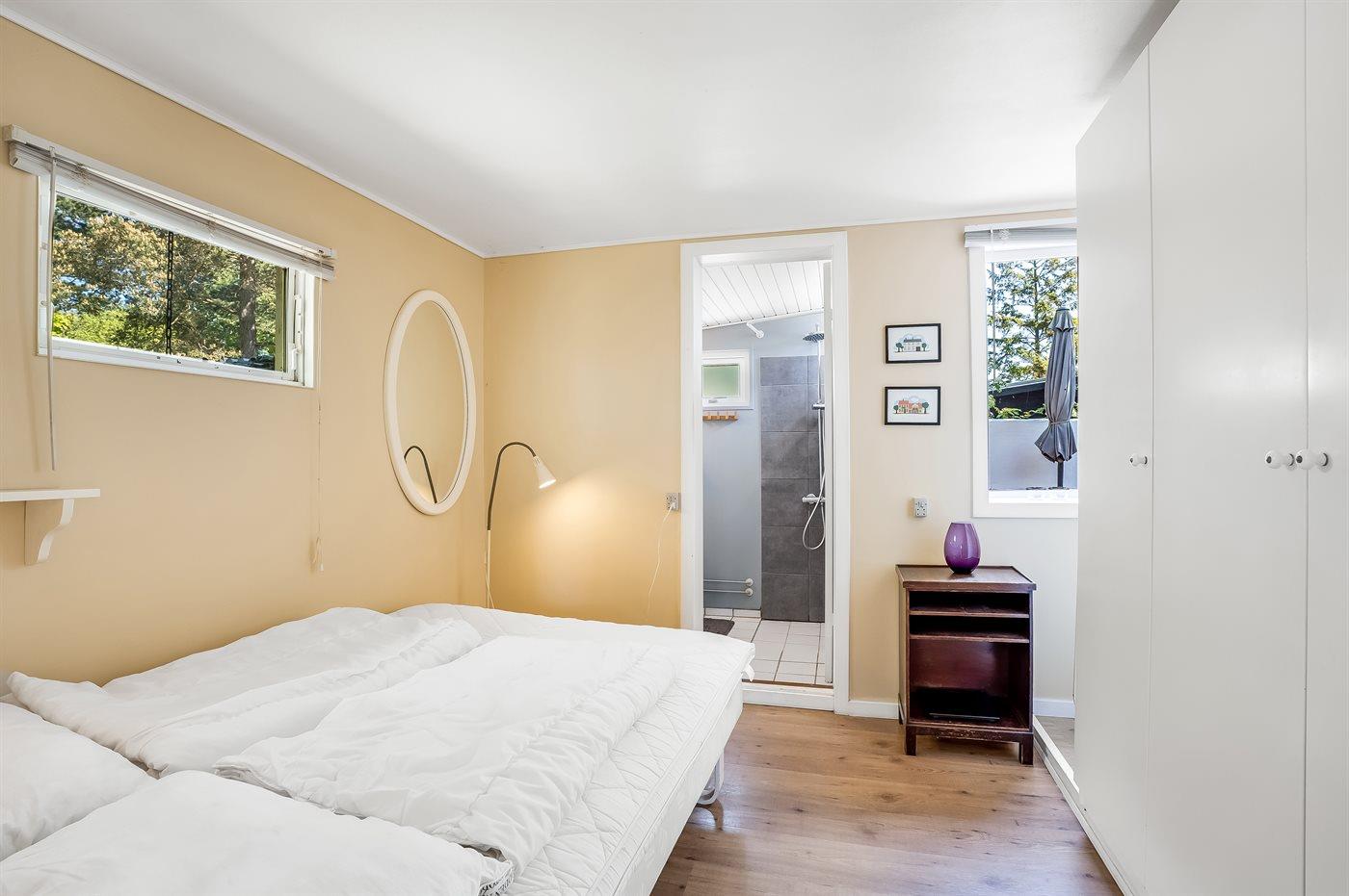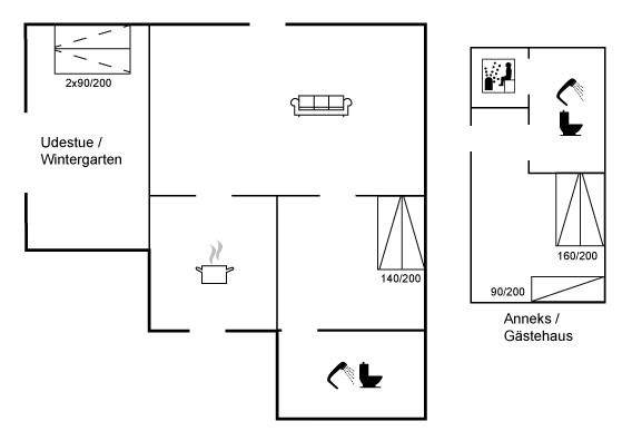 Die Schlafplätze verteilen sich auf 2 Schlafräume. 4 Schlafplätze in Doppelbetten.1 Schlafplatz in einem Einzelbett. 2 Schlafplätze auf einer Doppelschlafcouch. 3 von diesen Schlafplätzen befinden sich im Gästehaus und 2 befinden sich im Wintergarten.