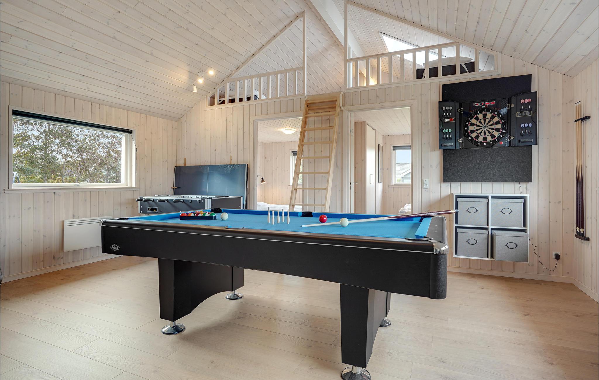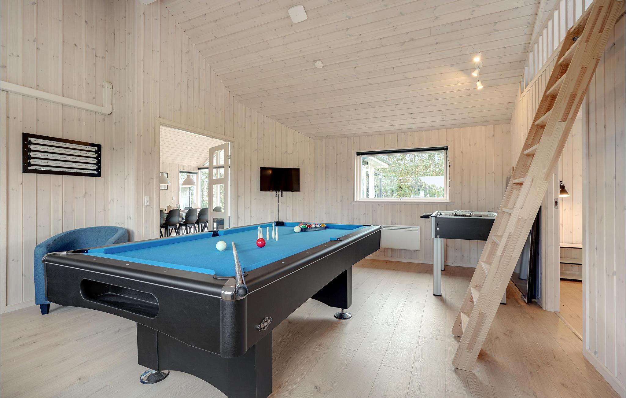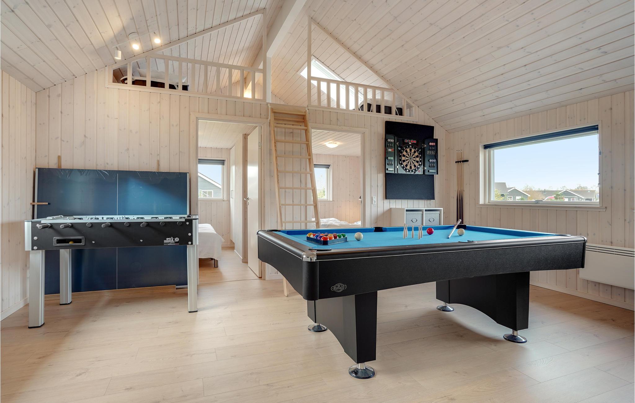 Willkommen in diesem geräumigen Ferienhaus, das Platz für eine Großfamilie oder mehrere befreundete Familien bietet. Betreten Sie das schöne Haus und fühlen Sie sich direkt wohl. Das Haus wird aufgrund der großen Fensterfronten von natürlichem Licht durchflutet und lädt Sie ein in den Gemeinschaftsräumen die Zeit gemeinsam zu verbringen. Im klassischen Wohnraum mit Essbereich und Küche können Sie spielen und sich entspannen, während im Aktivitätsraum der Spaß und der Wettbewerb im Fokus stehen. Auch eine Entspannungsoase steht für Sie bereit mit einem Whirlpool für mehrere Personen und eine Sauna.