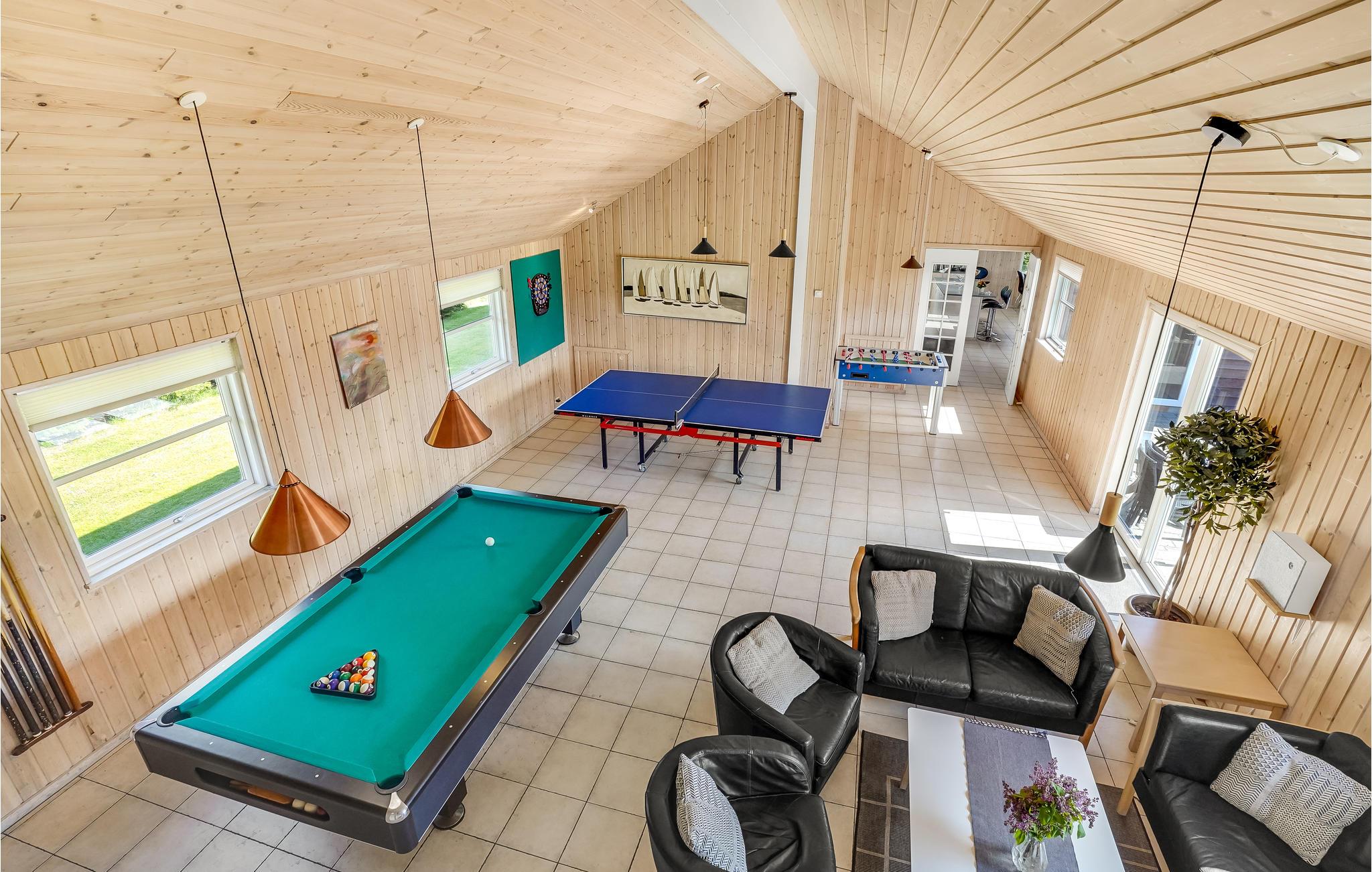 Mit 8 Schlafzimmern und 3 Bädern bietet es komfortabel Platz für 24 Personen, die hier gemeinsam einen schönen Urlaub verbringen können. Es gibt eine Sauna, die nach einem langen Spaziergang Entspannung bietet und die Möglichkeit, Billard, Darts, volleyball, basketball, badminton und Tischtennis zu spielen. Machen Sie es sich an kühleren Abenden gemeinsam am Kaminofen gemütlich.