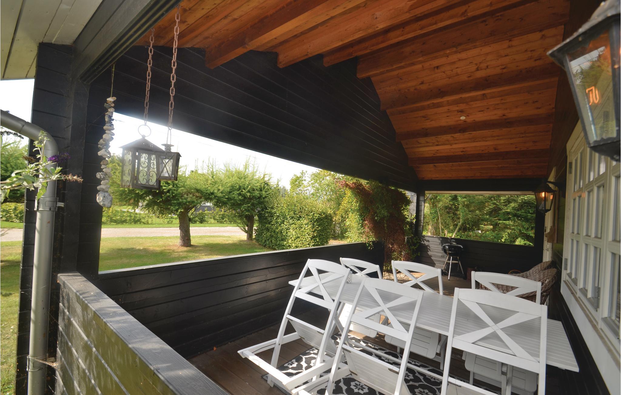 Interessant eingerichtetes Blockhaus mit überdachter Terrasse.