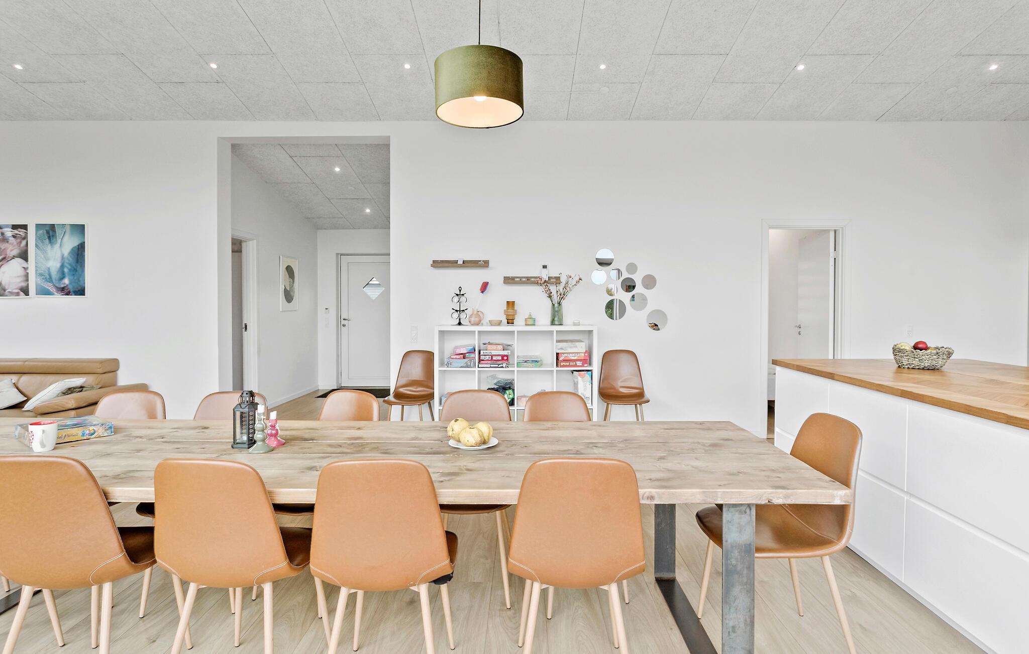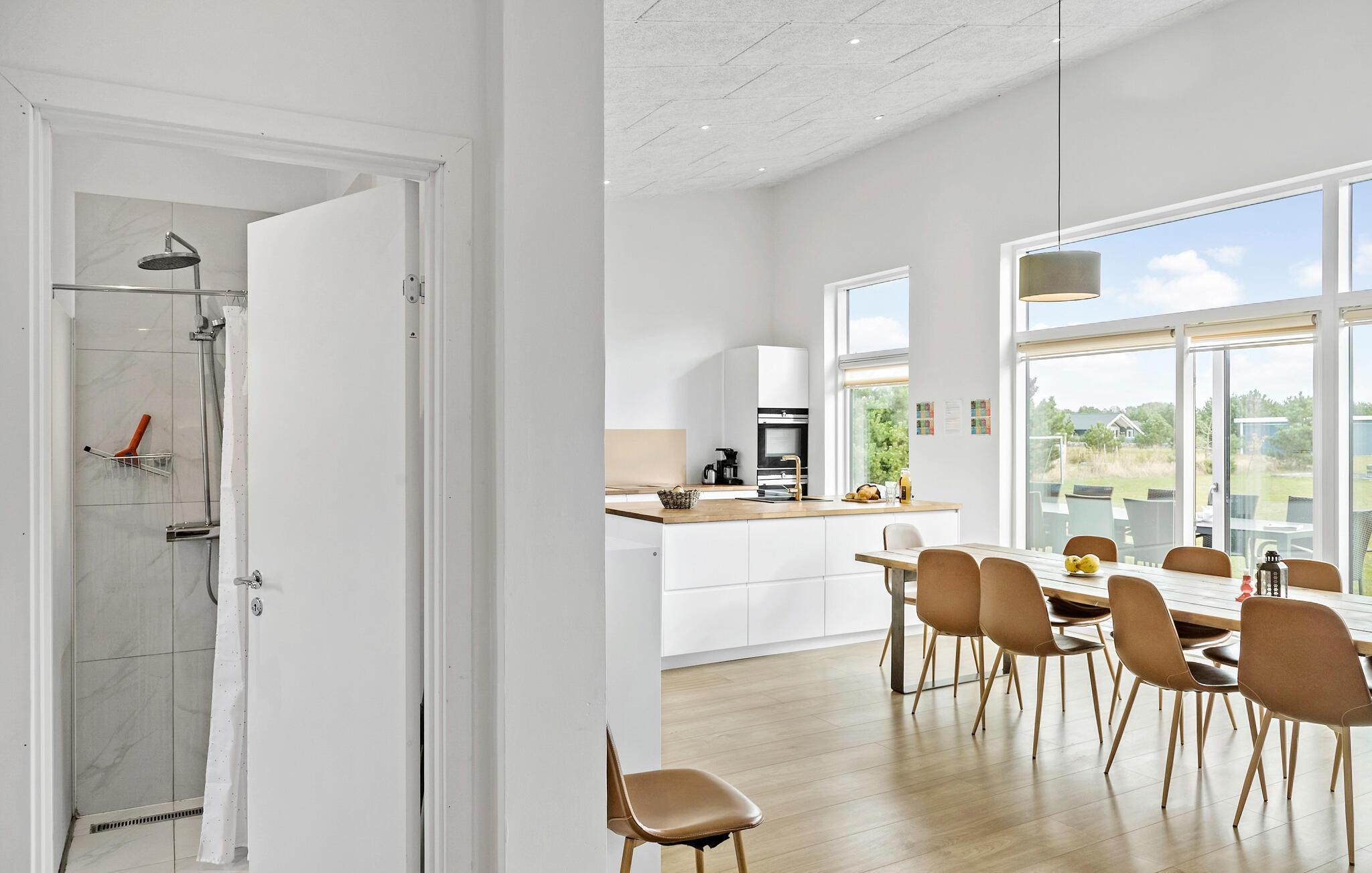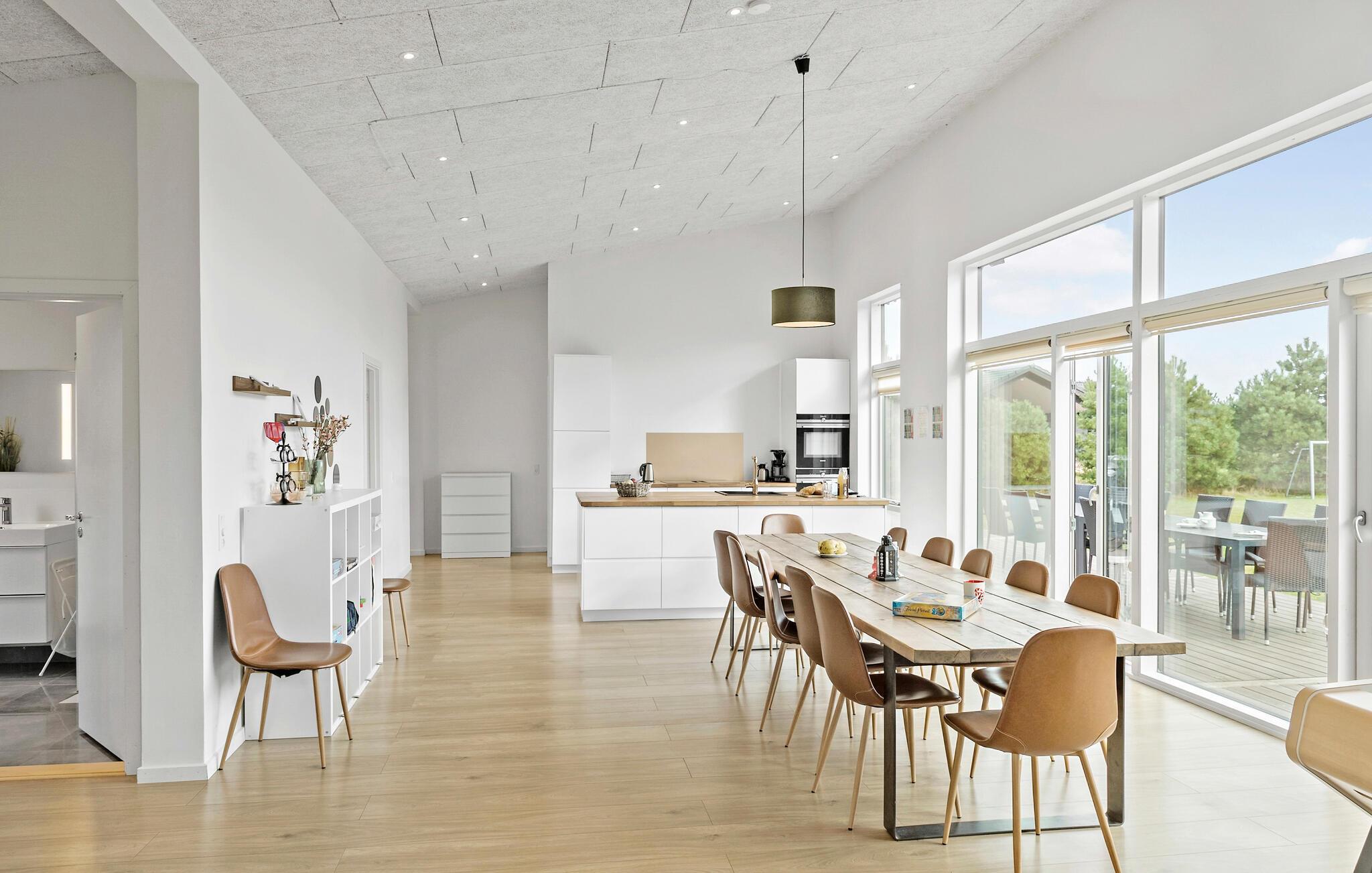 Dieses elegante Ferienhaus bietet Ihnen und Ihrer Familie den idealen Rückzugsort für eine wohlverdiente Pause. Starten Sie den Tag mit einem entspannten Frühstück am Esstisch oder auf der sonnigen Terrasse, während Sie die frische Luft und den Ausblick auf die grüne Umgebung genießen. Der lichtdurchflutete Wohnbereich mit seinem hellen Ambiente und den großen Fenstern sorgt für eine angenehme Atmosphäre und eröffnet den Blick auf den weitläufigen Garten. Machen Sie es sich in der bequemen Sofaecke gemütlich und genießen Sie einen Film oder ein gutes Buch.
