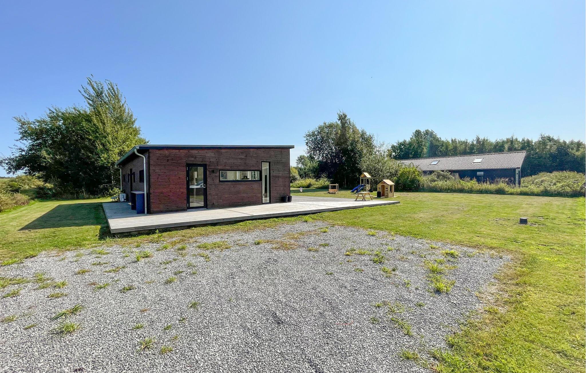 Modernes Ferienhaus in Marielyst mit Terrasse, Garten und Spielturm für entspannte Familienferien am Meer.
