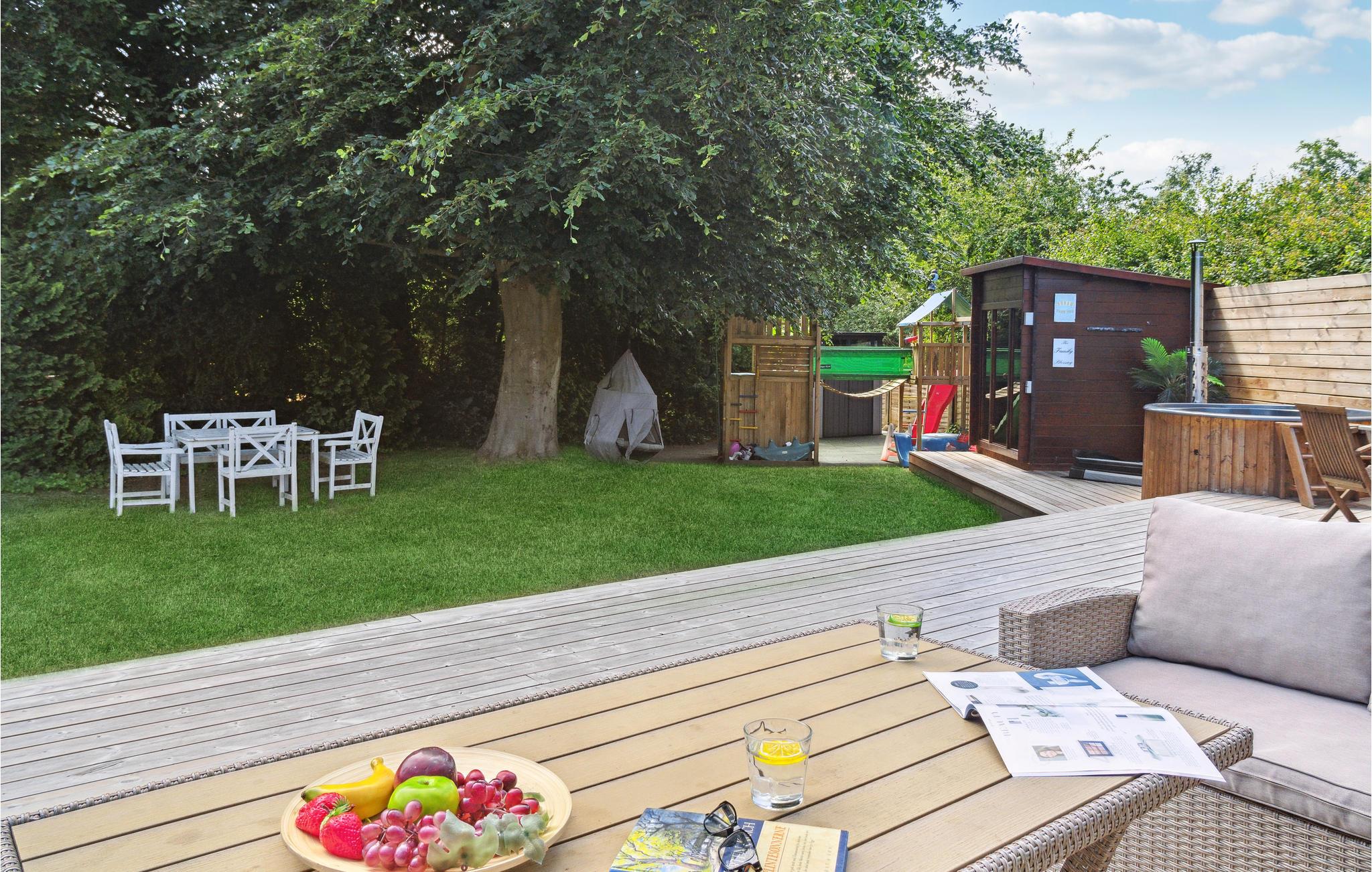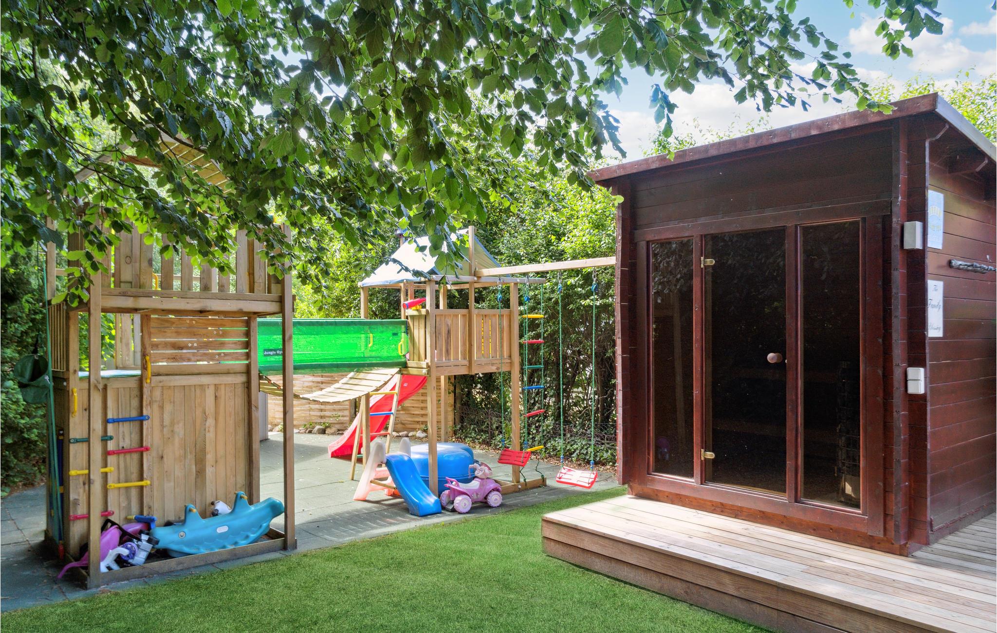 Im attraktiven Außenbereich des Hauses kommen alle Familienmitglieder auf ihre Kosten. Genießen Sie die Sonne auf der Terrasse, während Ihre Kinder auf dem Grundstück herum flitzen und eifrig klettern, rutschen und Trampolin springen. Servieren Sie anschließend leckeres Grillessen für die ganze Truppe und beenden Sie den Tag im finnischen Holzbad unter dem Sternenhimmel.