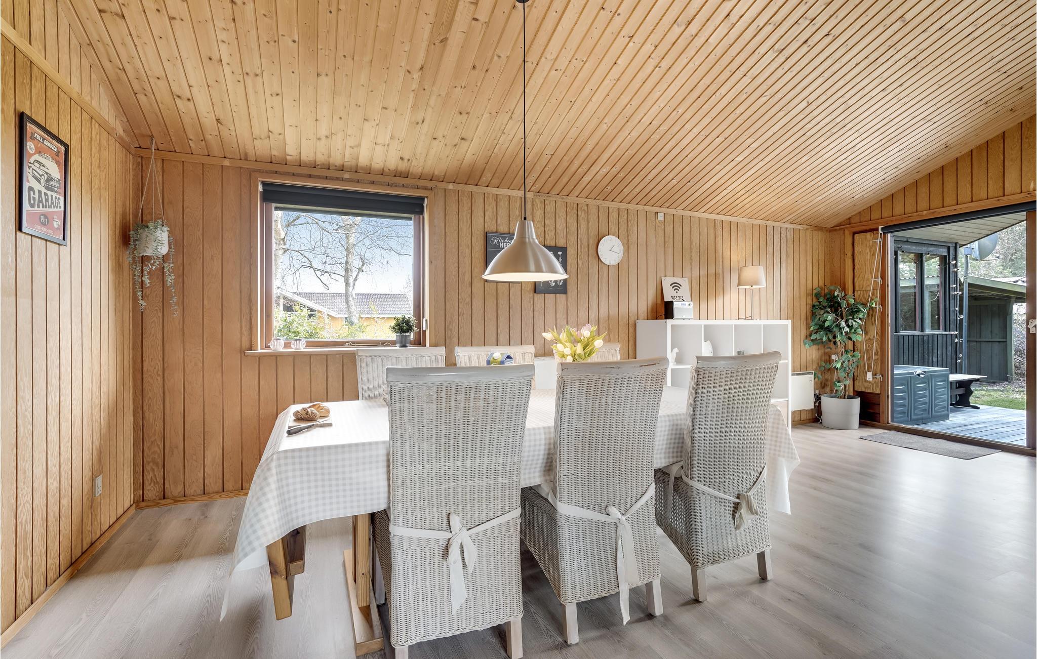 Naturnahes Ferienhaus mit Holzverkleidung, großem Garten und Kamin, nahe Sandstrand in Marielyst, Dänemark.