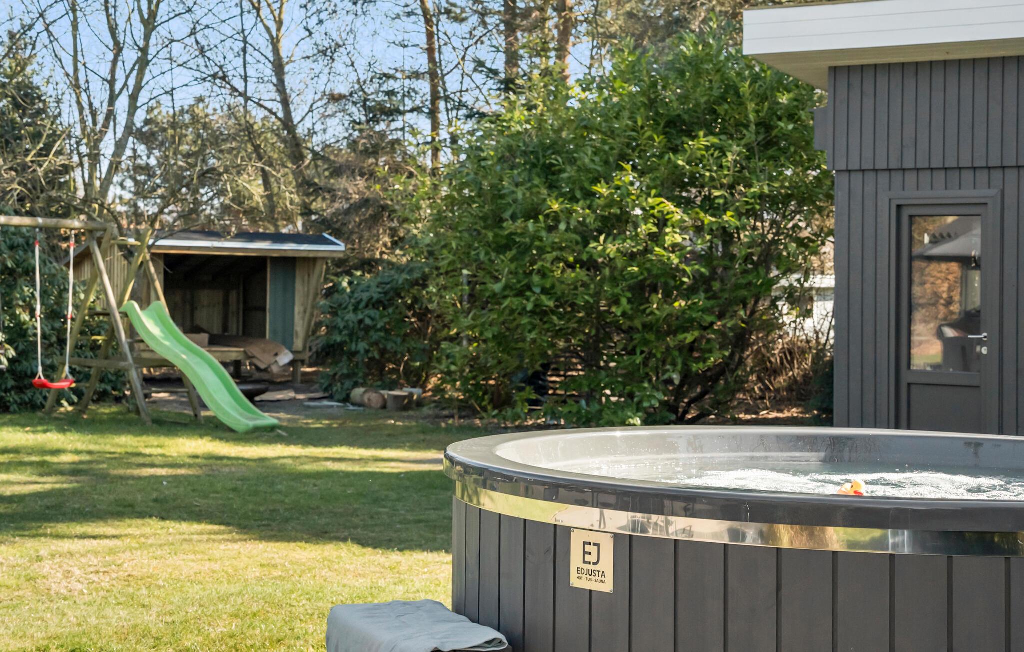 Auch für Entspannung ist gesorgt. Tauchen Sie ein in die wohltuende Wärme des Finnischen Holzbades auf der Terrasse. Ihre Kinder können sich währenddessen auf dem Trampolin austoben oder auf der Rutsche und der Schaukel spielen. Lassen Sie den Tag beim Grillen oder bei geselligem Beisammensein an der Feuerstelle unter freiem Himmel ausklingen.